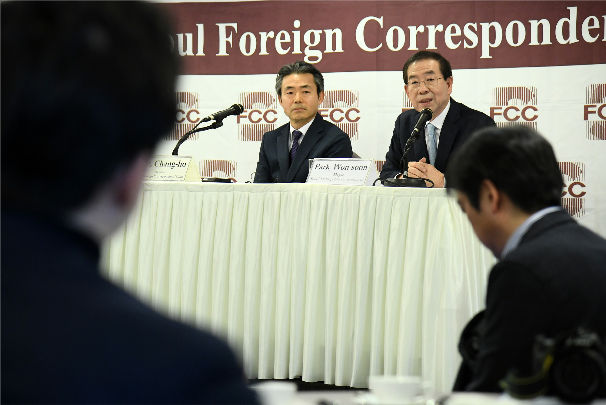 박원순 서울시장이 30일 오후 3시10분 서울 중구 프레스센터 18층 서울외신기자클럽 라운지에서 미국 WSJ, 프랑스 AFP통신, 일본 교도통신 등 24개 외신의 서울주재 특파원 40여명이 참석한 가운데 신년 기자회견을 갖고 있다. 서울시 제공