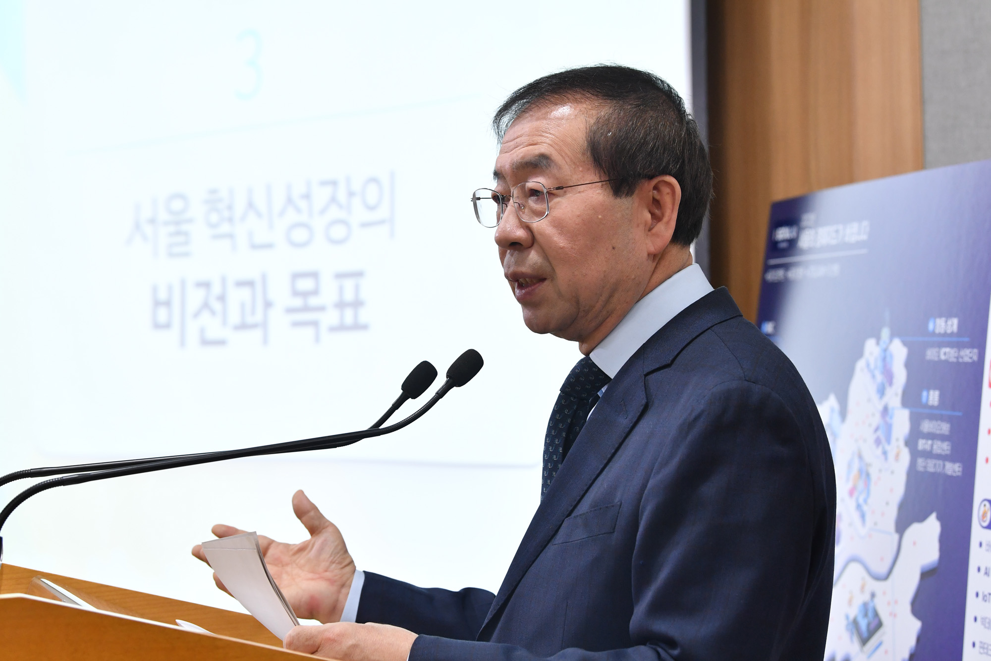 박원순 서울시장이 31일 오전 서울시청 브리핑룸에서 기자설명회를 열어 서울형 유망산업에 5년간 3조 4000억원 집중투자 혁신성장프로젝트 정책을 발표하고 있다. 서울시 제공
