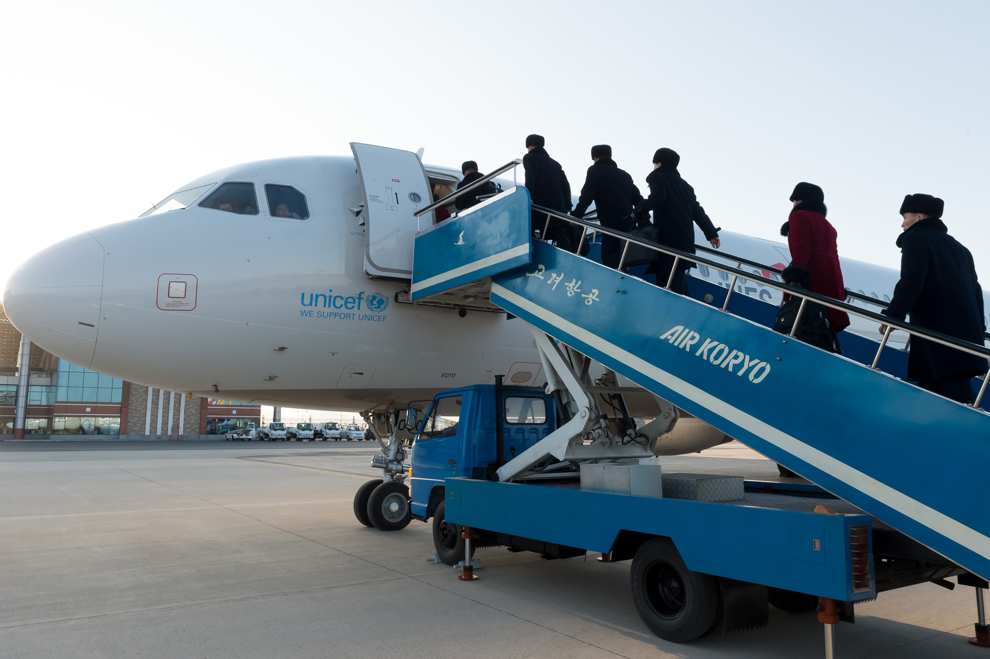 북한 선수단 원길우 단장(체육성부상)과 평창 동계올림픽 북한 선수단이 1일 강원도 원산 갈마국제공항에서 양양 국제공항으로 향하는 전세기에 오르고 있다. 양양=사진공동취재단