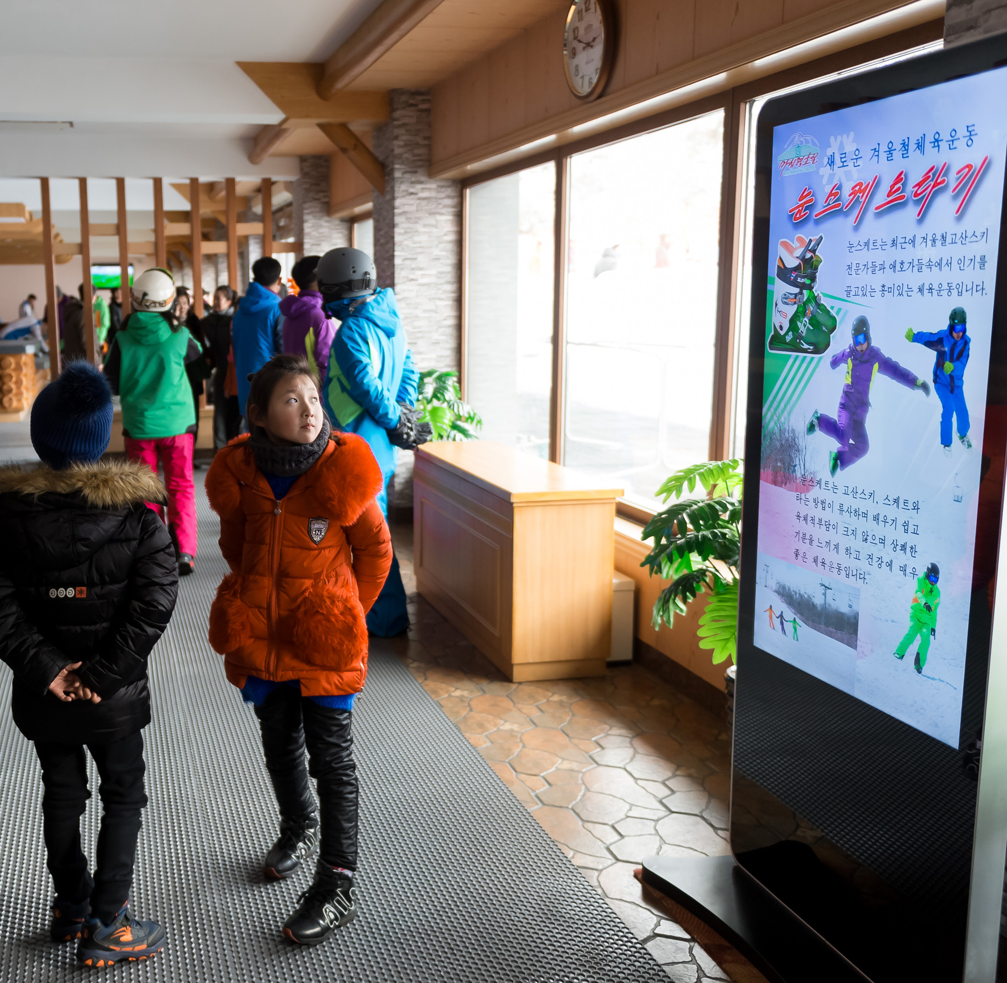 30일 북한 강원도 원산 인근에 위치한 마식령스키장을 찾은 한 북한 어린아이가 눈스케이트타기 홍보물을 바라보고 있다./원산=사진공동취재단