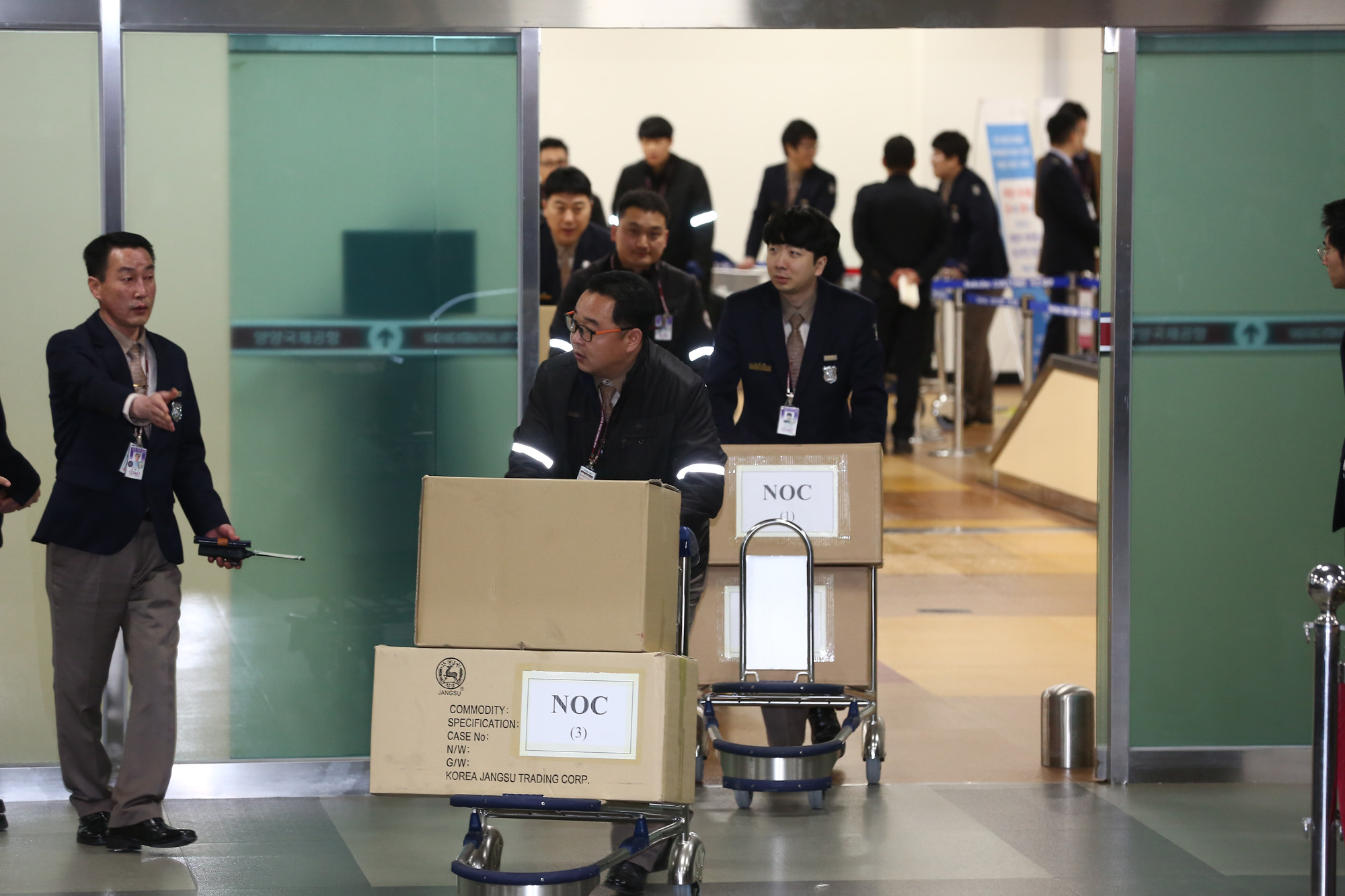 원길우 체육성 부상이 이끄는 북측 평창동계올림픽 참가 선수단 의 화물이 양양공항을 통해 들어오고 있다.