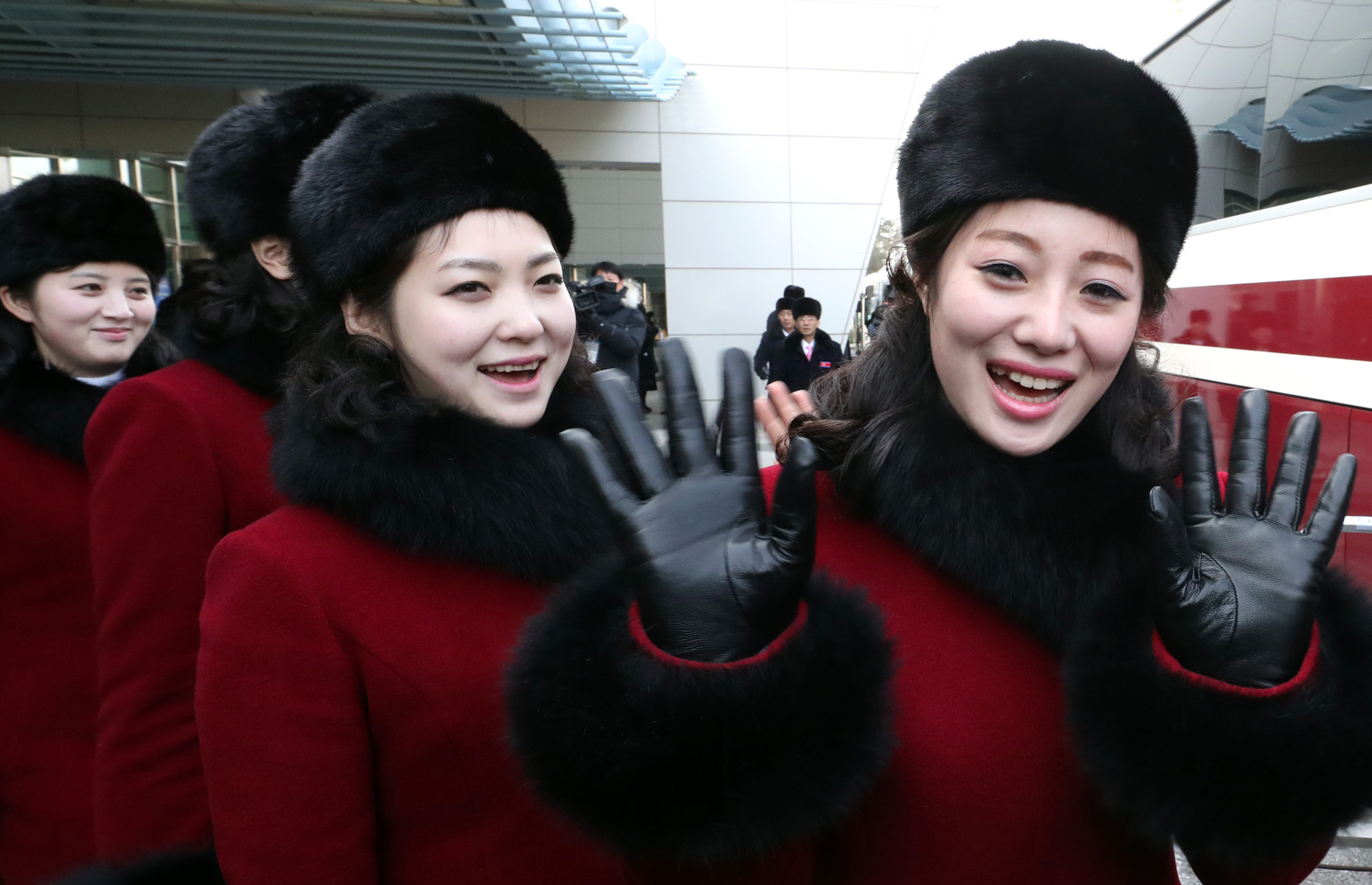 평창동계올림픽에 참가하는 북한 응원단이 7일 오전 경기도 파주시 남북출입사무소(CIQ)를 통해 입경, 차량에 오르기 전 손을 흔들고 있다. 구체적인 방남 인원은 북한 민족올림픽위원회(NOC) 관계자 4명, 응원단 229명, 태권도 시범단 26명, 기자단 21명이다. /사진공동취재단