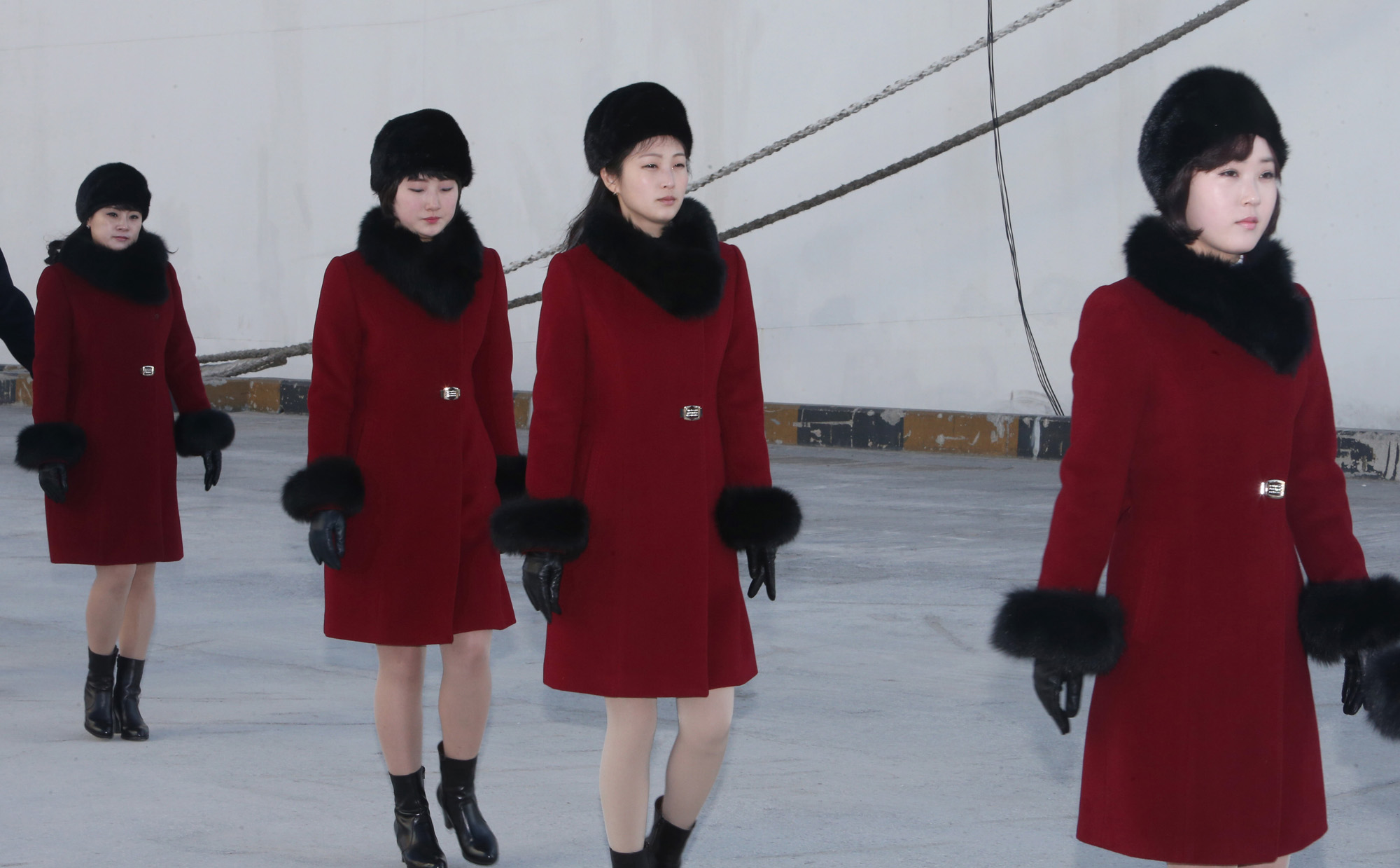 북한 권혁봉 문화성 국장과 현송월 삼지연관현악단장을 비롯한 북측 예술단이 7일 오전 강원 동해시 묵호항에 전날 정박한 만경봉92호에서 하선해 차량으로 이동하고 있다. 사진공동취재단
