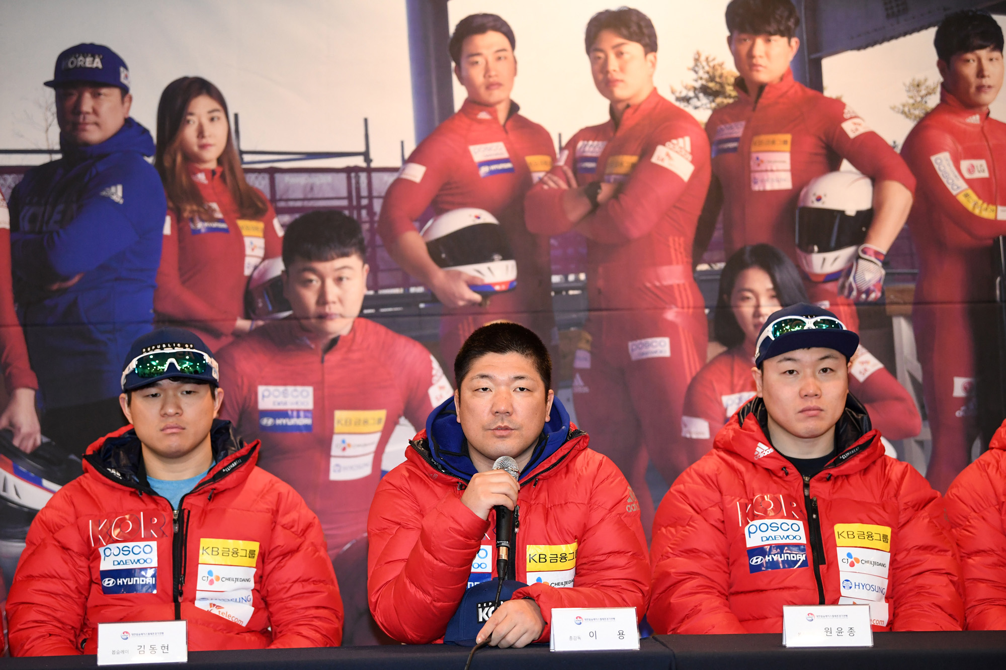 31일 오후 강원도 평창군 용평리조트에서 열린 2018 평창동계올림픽 출전 봅슬레이, 스켈레톤 국가대표팀 미디어데이에서 김동현, 이용 총감독, 원윤종 선수가 참석해 취재진의 질문에 답하고 있다. 사진공동취재단.
