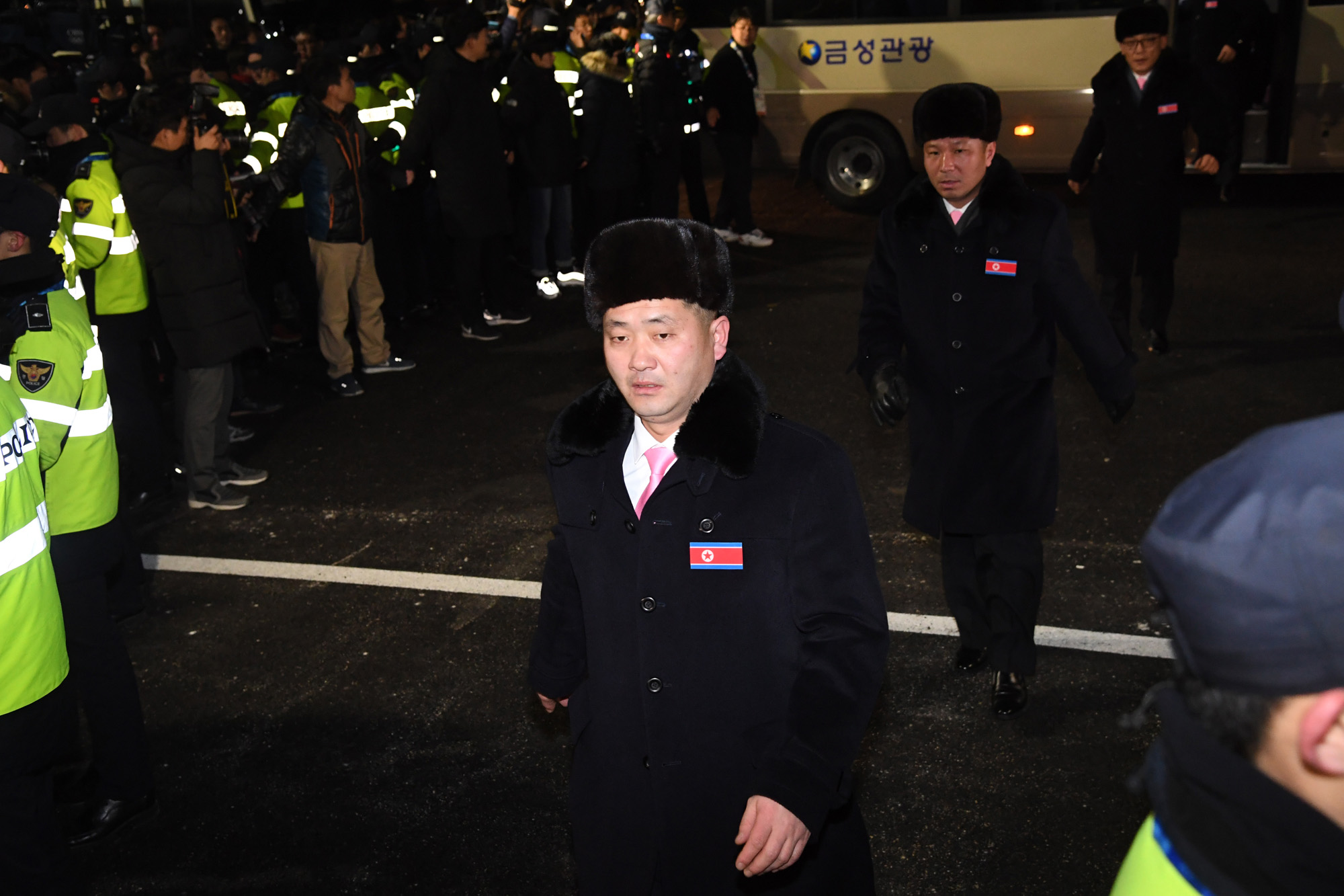 2일 저녁 2018 평창동계올림픽에 출전하는 북한대표팀 선수단과 본진이 강원도 강릉 올림픽 선수촌에 도착하고 있다. 18.02.01. 사진공동취재단.