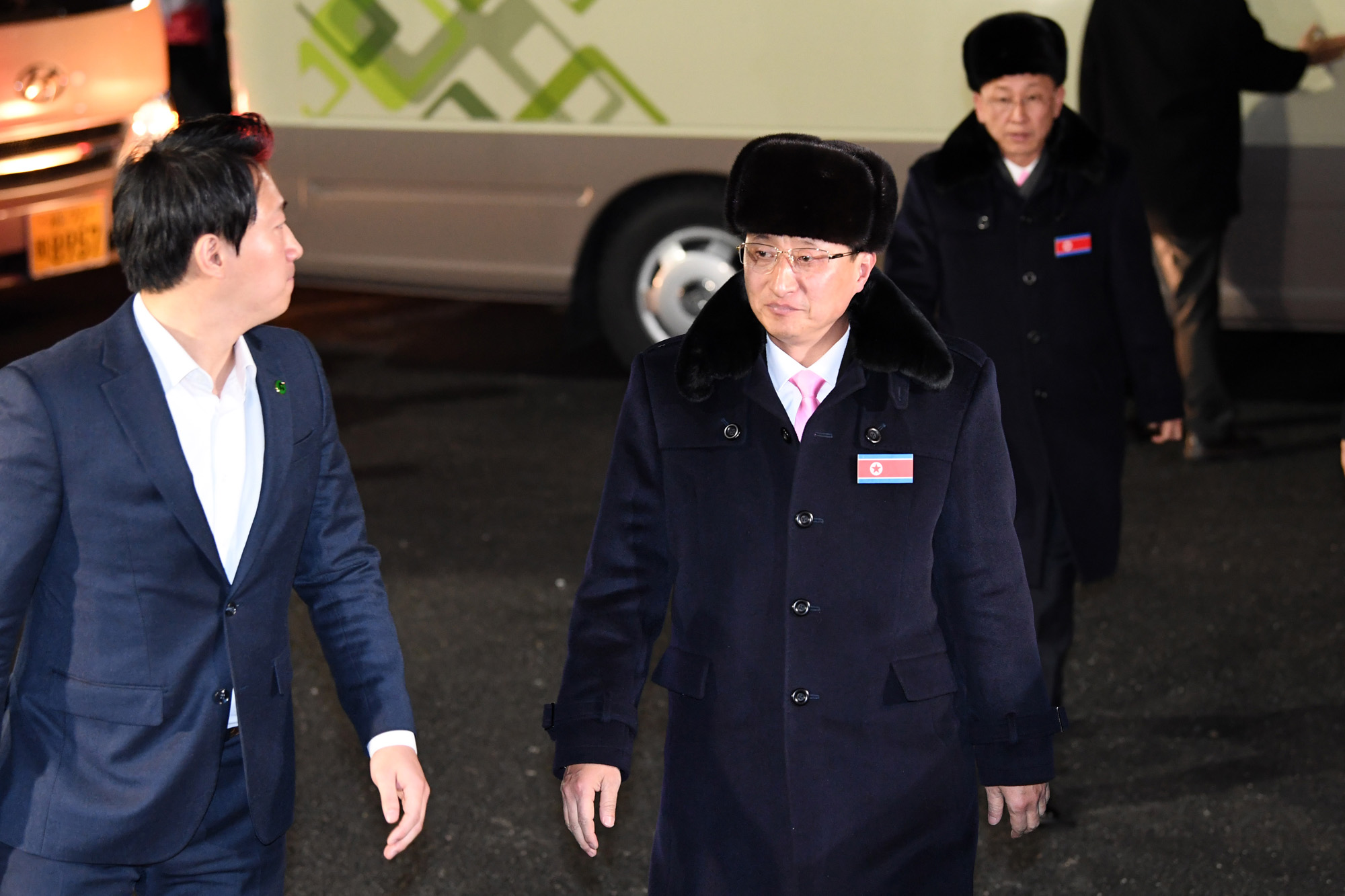 2일 저녁 2018 평창동계올림픽에 출전하는 북한대표팀 원길우 체육성 부상 선수단장이 강원도 강릉 올림픽 선수촌에 도착하고 있다. 18.02.01. 사진공동취재단.