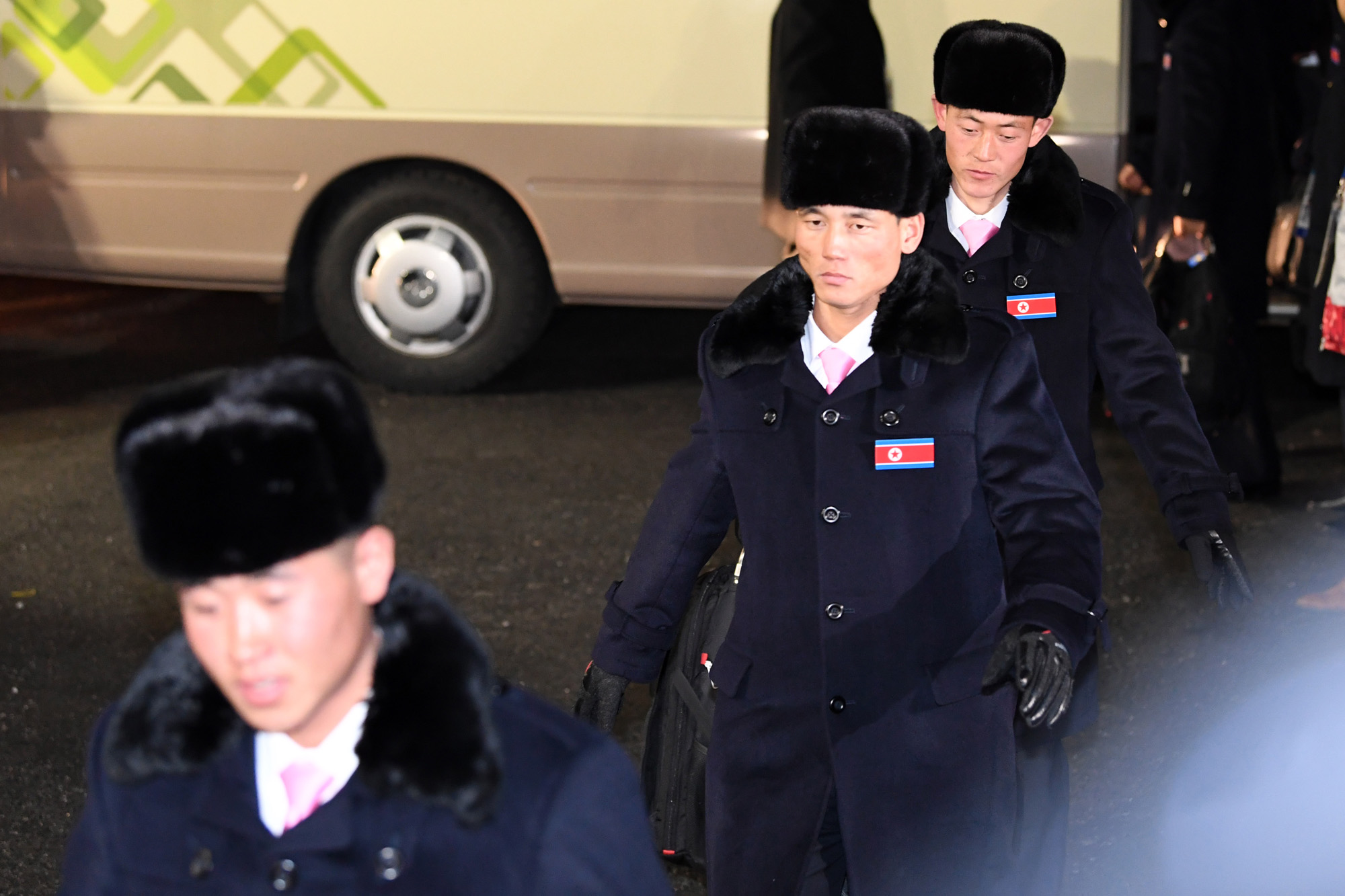 2일 저녁 2018 평창동계올림픽에 출전하는 북한대표팀을 비롯한 본진이 강원도 강릉 올림픽 선수촌에 도착하고 있다. 18.02.01. 사진공동취재단.