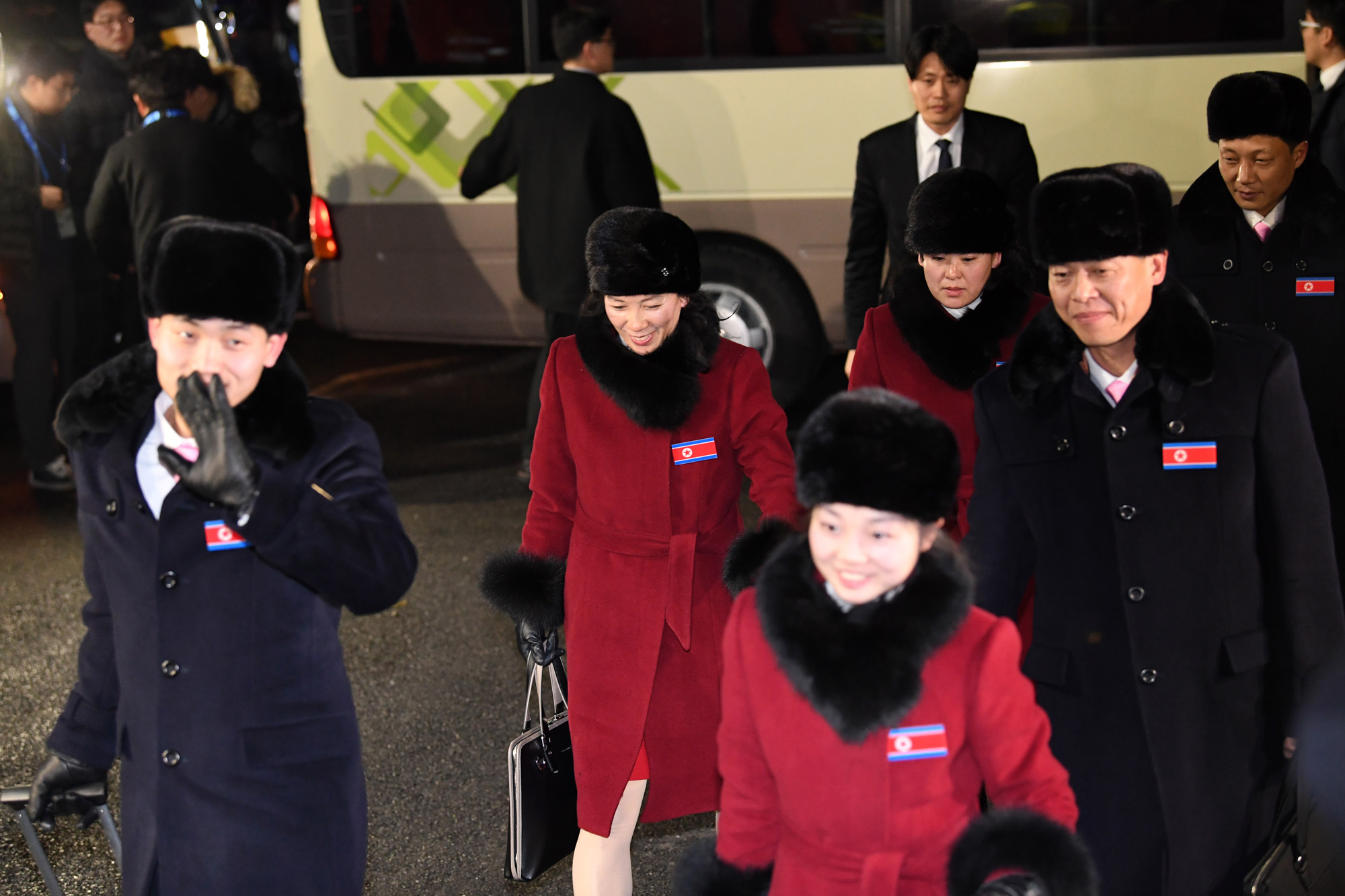 2일 저녁 2018 평창동계올림픽에 출전하는 북한대표 피겨스케이팅 대표팀이 강원도 강릉 올림픽 선수촌에 도착하고 있다. 18.02.01. 사진공동취재단.