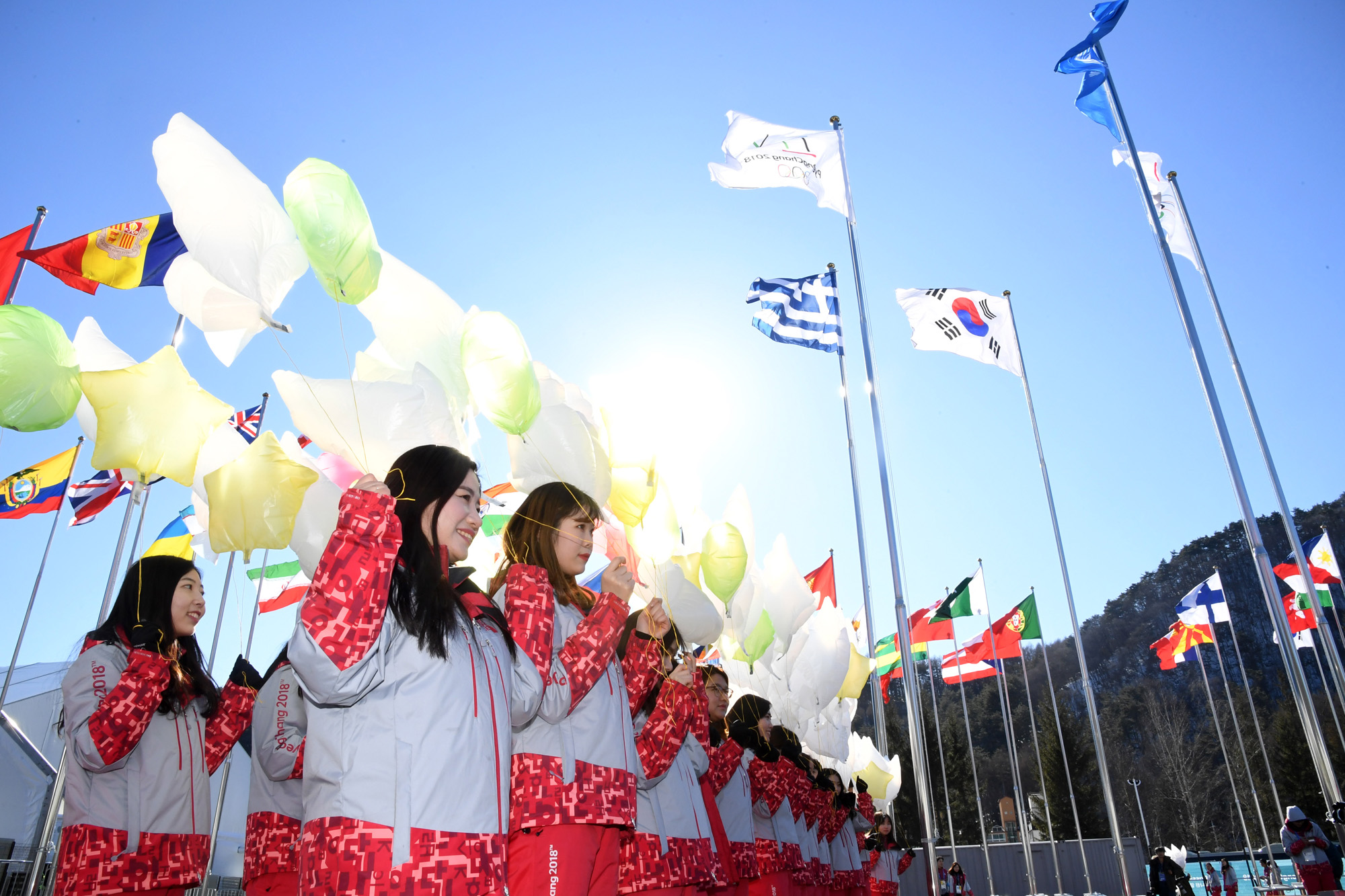 1일 오후 강원도 평창군 평창선수촌에서 열린 개촌식에 자원봉사자들이 평화의 비둘기 풍선을 들고 있다. 18.02.01. 사진공동취재단.