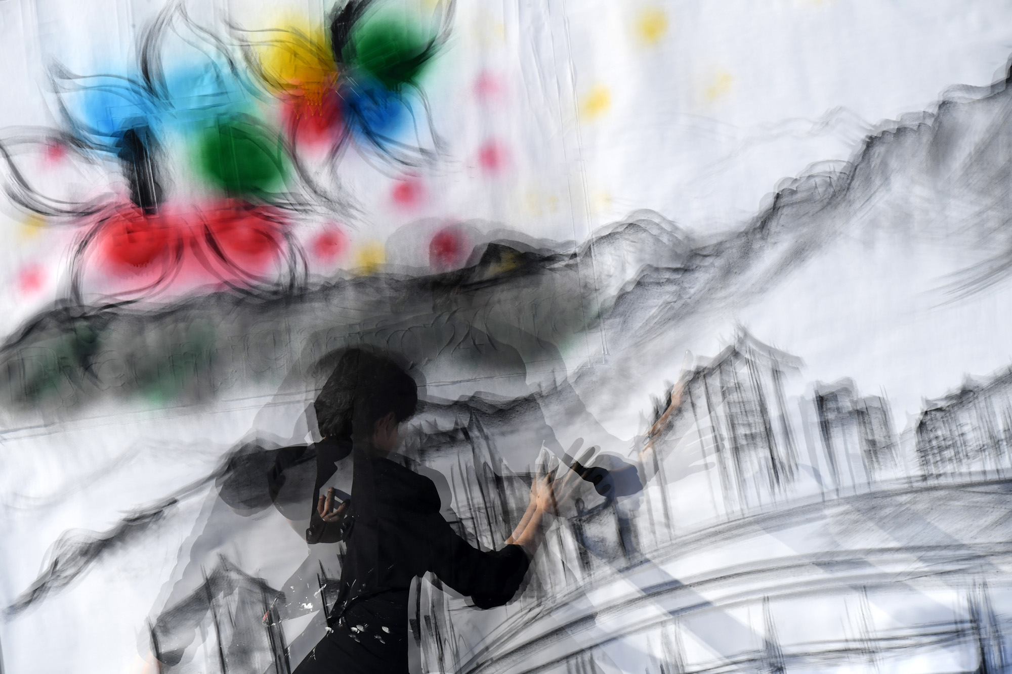 1일 오후 강원도 평창군 평창선수촌에서 열린 개촌식에 김잔디씨가 드로잉쇼를 펼치고 있다. 18.02.01. 사진공동취재단.