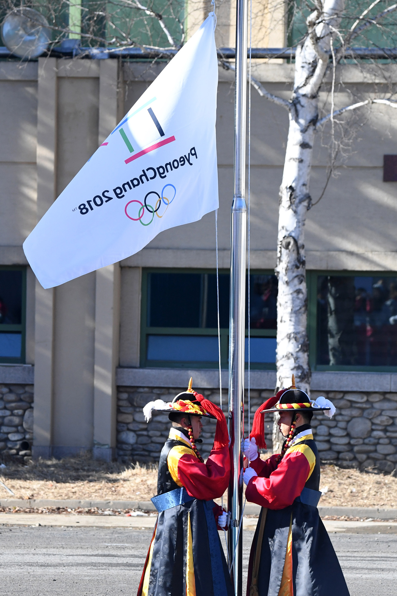 1일 오후 강원도 평창군 평창선수촌에서 열린 개촌식에 태극기와 평창올림픽기가 계양되고 있다. 18.02.01. 사진공동취재단.
