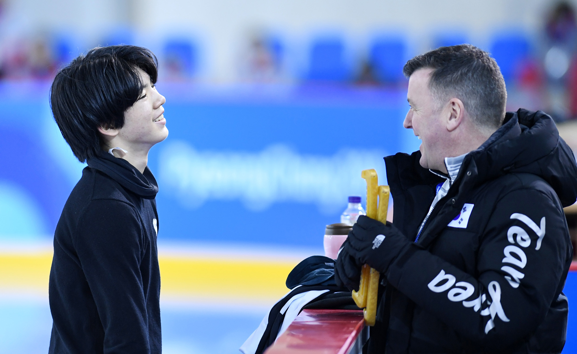남자 피겨 차준환이 2018평창동계올림픽 개막을 D-3일 앞둔 6일 오전 강원도 강릉시 강릉아레나 연습 링크에서 훈련을 마친뒤 브라이언 오서 코치와 이야기하고 있다. 18.02.06. 사진공동취재단.
