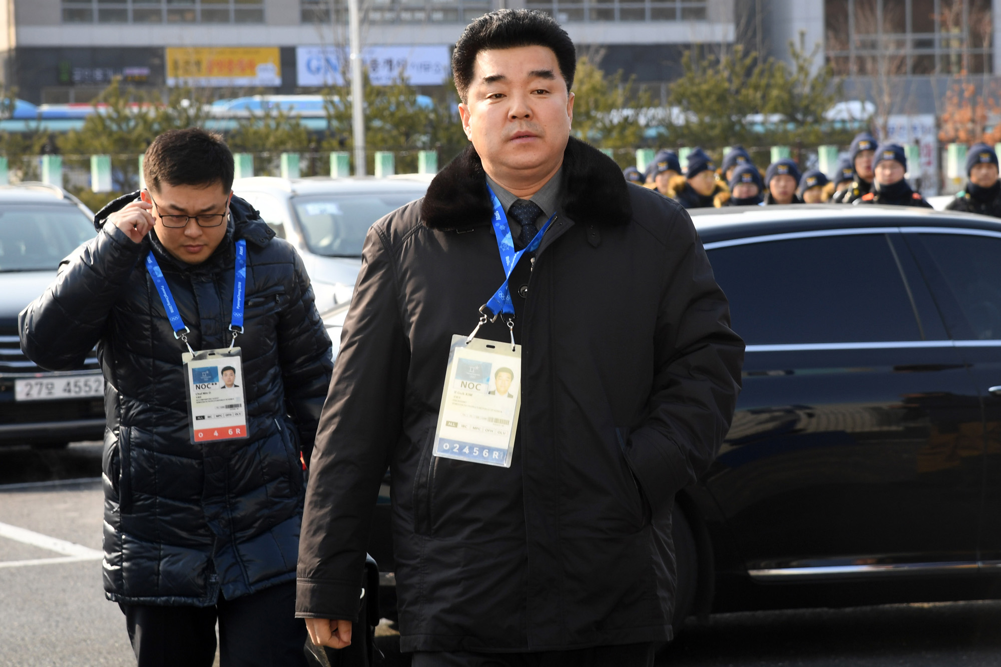 8일 오전 강릉선수촌에서 북한 대표팀 선수들의 입촌식을 앞두고 김일국 북한 체육상이 선수촌으로 향하고 있다. 18.02.08. 2018평창사진공동취재단.