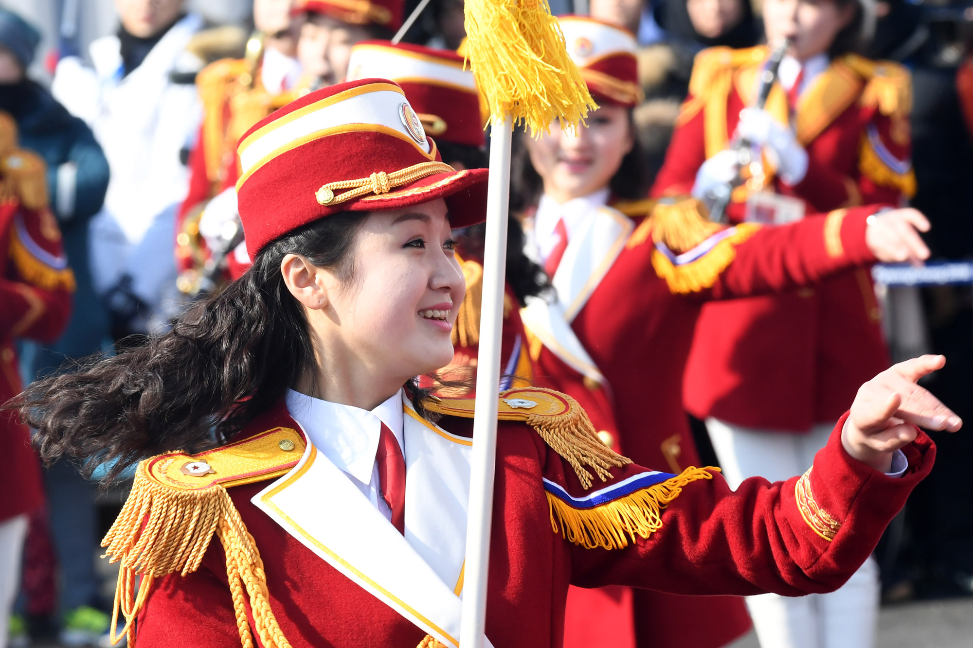 8일 오전 강릉선수촌에서 열린 북한 대표팀 입촌식에 북한 응원단이 공연을 펼치고 있다. 18.02.08. 2018평창사진공동취재단.