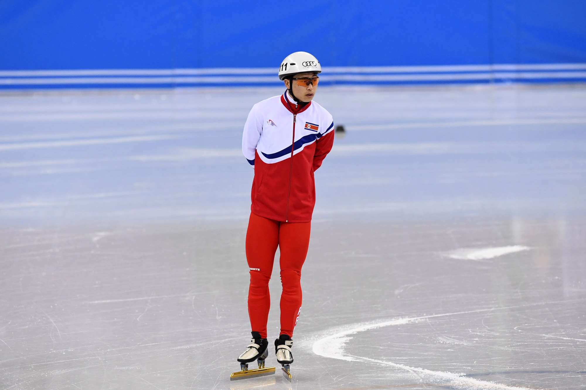 지난 2일 첫 훈련에서 부상을 입은 북한 쇼트트랙 대표팀 최은성 선수가 8일 오후 강원도 강릉 아이스아레나에서 진행된 한국 쇼트트랙 대표팀 훈련에 참가해 훈련을 기다리고 있다. 2018.02.08. 2018평창사진공동취재단