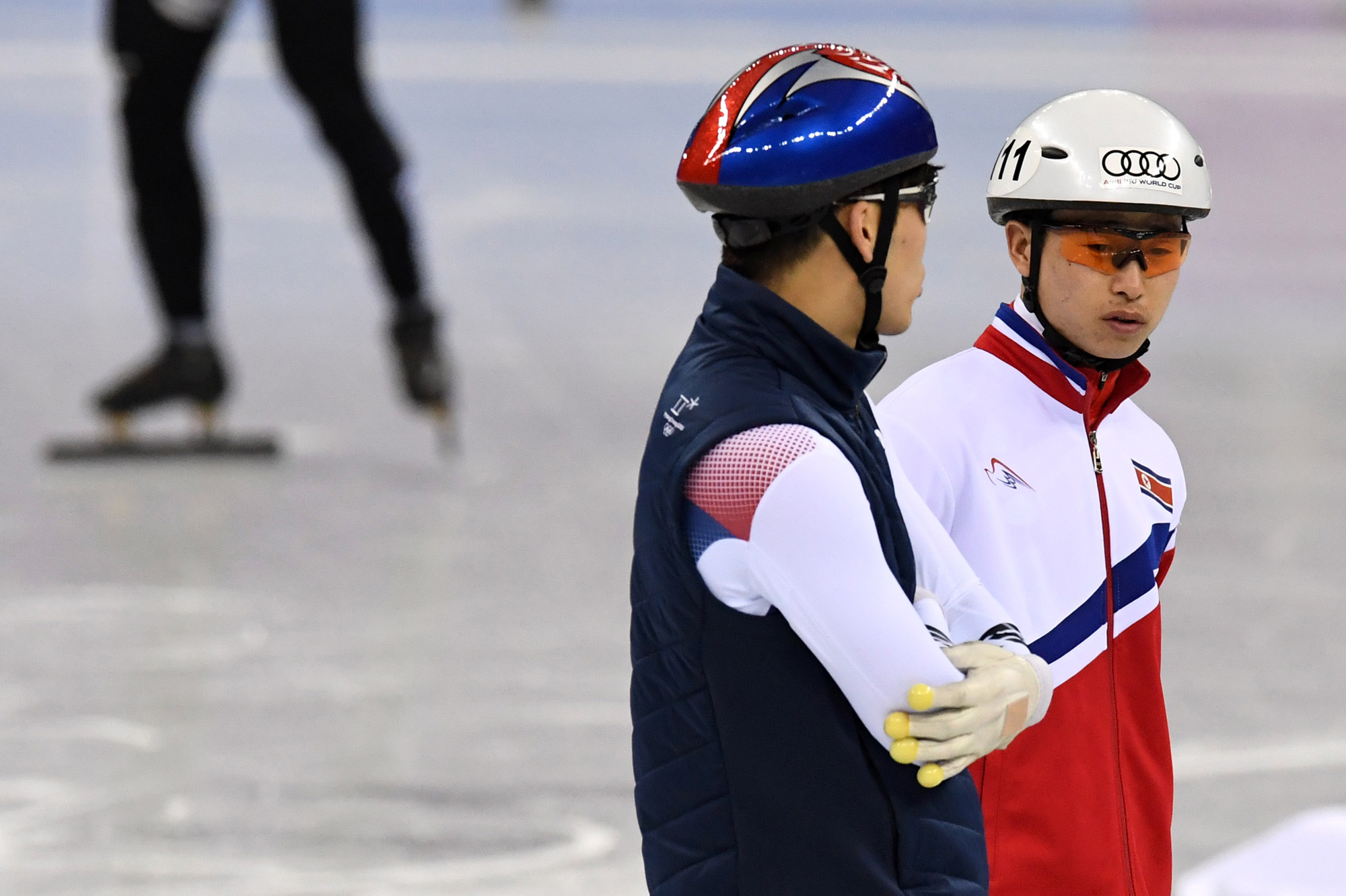 지난 2일 첫 훈련에서 부상을 입은 북한 쇼트트랙 대표팀 최은성 선수가 8일 오후 강원도 강릉 아이스아레나에서 진행된 한국 쇼트트랙 대표팀 훈련에 참가해 한국 대표팀 코치와 대화하고 있다. 2018.02.08. 2018평창사진공동취재단