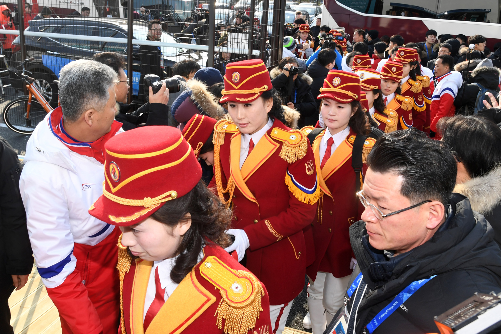 8일 오전 강릉선수촌에서 북한 대표팀 선수들의 입촌식을 앞두고 북한 응원단이 선수촌으로 향하고 있다. 2018. 02. 08. 2018평창사진공동취재단