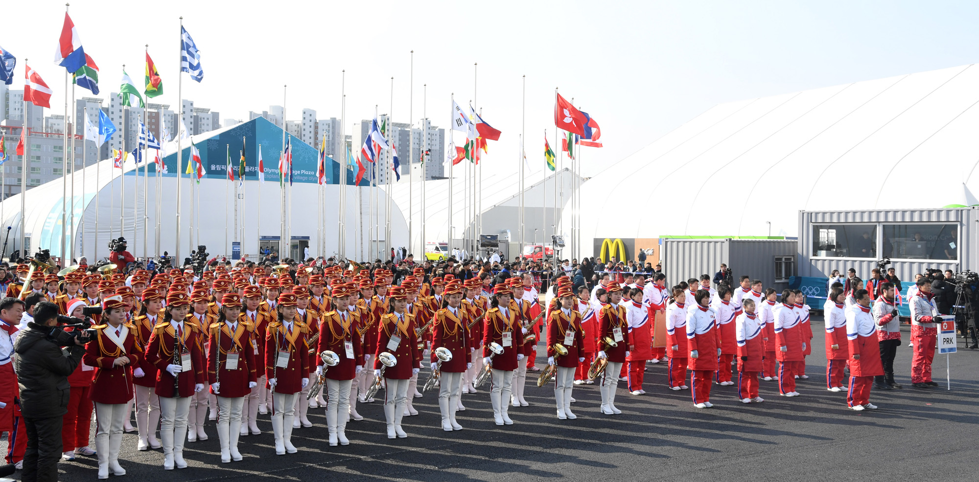 8일 오전 강릉선수촌에서 열린 북한 대표팀 입촌식에 북한 선수단과 응원단이 사열해 있다.2018. 02. 08. 2018평창사진공동취재단