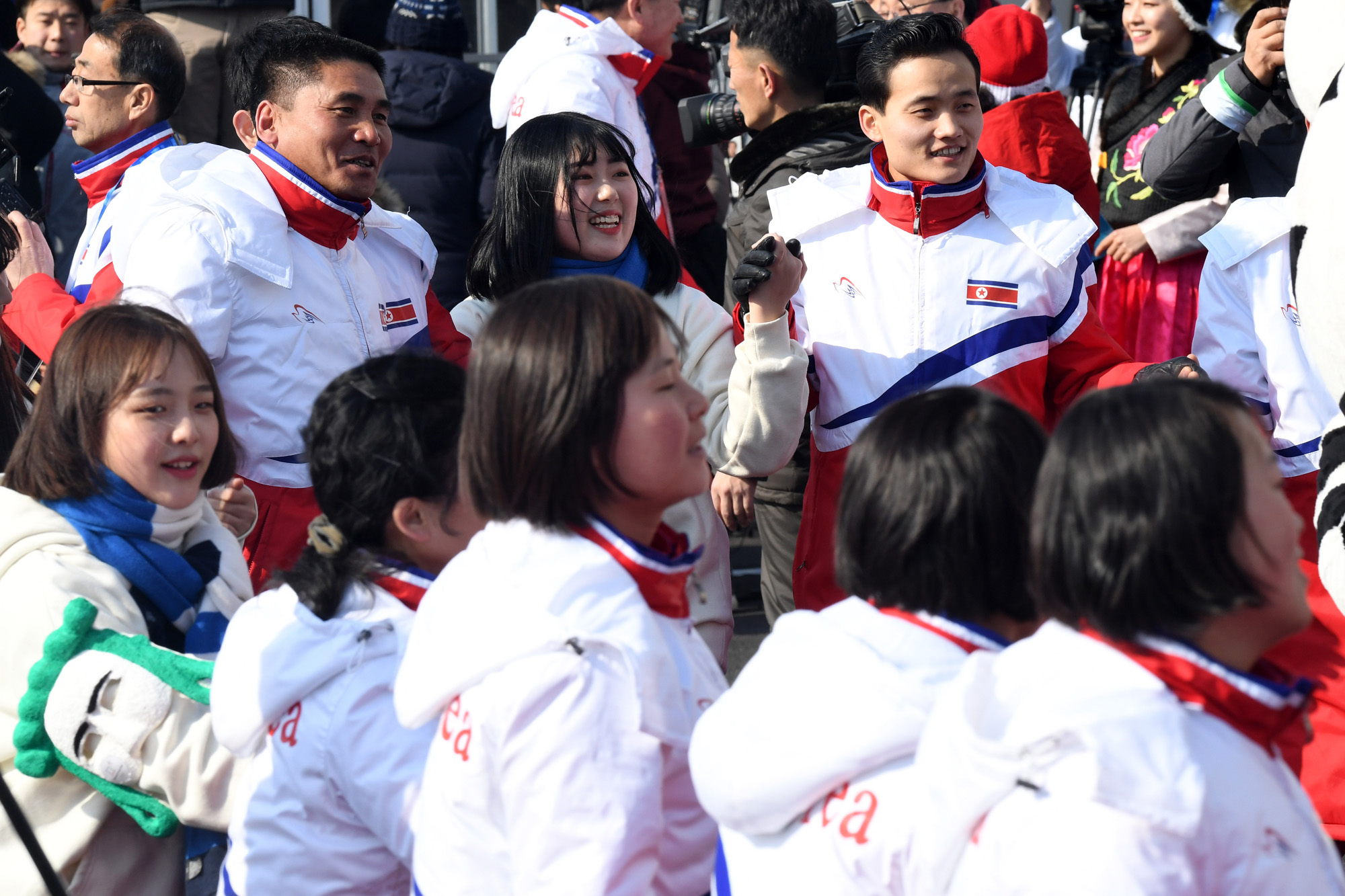 8일 오전 강릉선수촌에서 북한 대표팀 선수들의 입촌식을 앞두고 북한 선수단 김주식이 공연팀과 손을 잡고 춤을 추고 있다.2018. 02. 08. 2018평창사진공동취재단