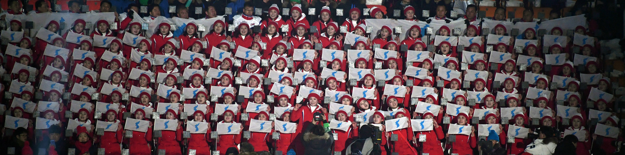 9일 오후 강원도 평창 올림픽 스타디움에서 2018 평창동계올림픽 개회식을 앞두고 북한 응원단이 한반도기를 흔들며 노래를 부르고 있다.