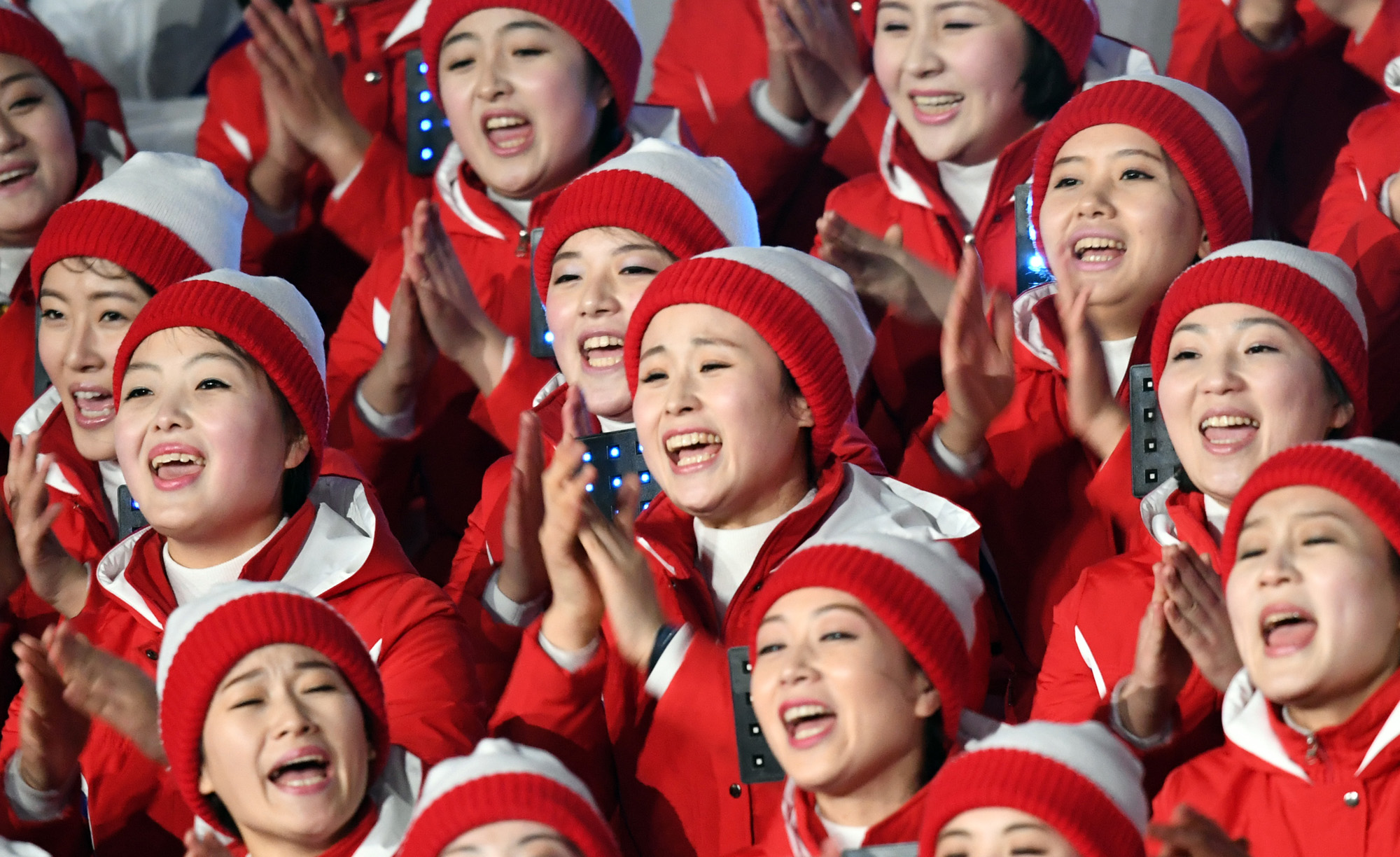 9일 오후 강원도 평창 올림픽 스타디움에서 열린 2018 평창동계올림픽 개회식에서 북한 응원단들이 우리는 하나다를 외치고 있다./임영무 기자