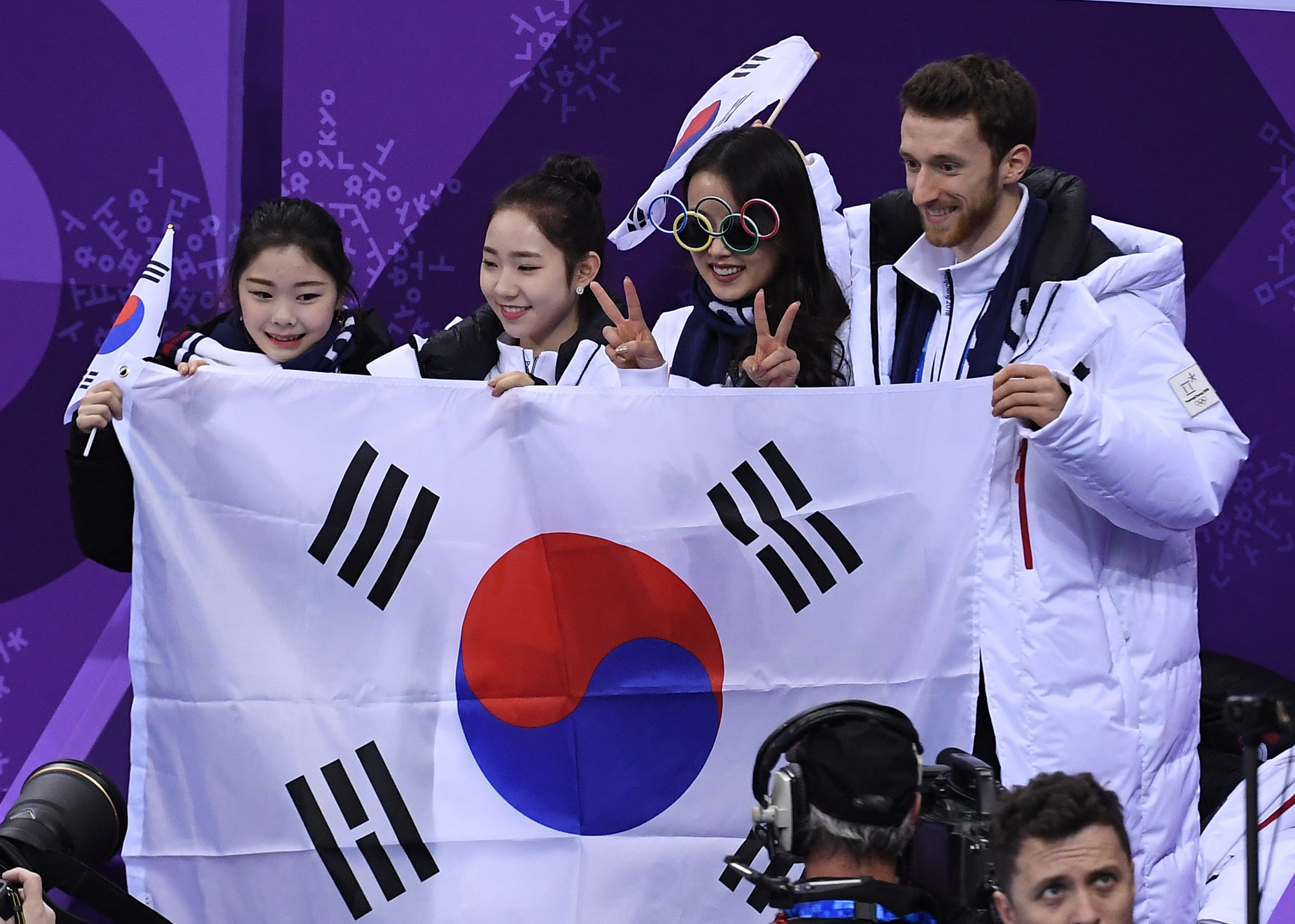 피겨 김하늘, 최다빈, 민유라, 겜린(왼쪽부터)이 9일 오전 강원도 강릉아이스아레나에서 진행된 '2018 평창동계올림픽' 피겨 스케이팅 팀이벤트 남자 싱글 쇼트 프로그램에서 차준환을 응원하고 있다.