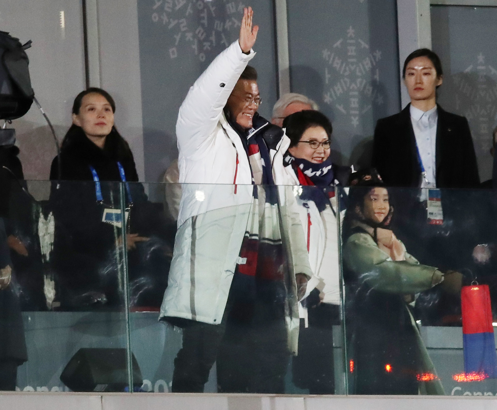 9일 오후 강원도 평창 올림픽 스타디움에서 열린 2018 평창동계올림픽 개회식에서 문재인 대통령이 입장하고 있다. 뒤에 앉아 있는 북한 김여정. / 오종찬 기자