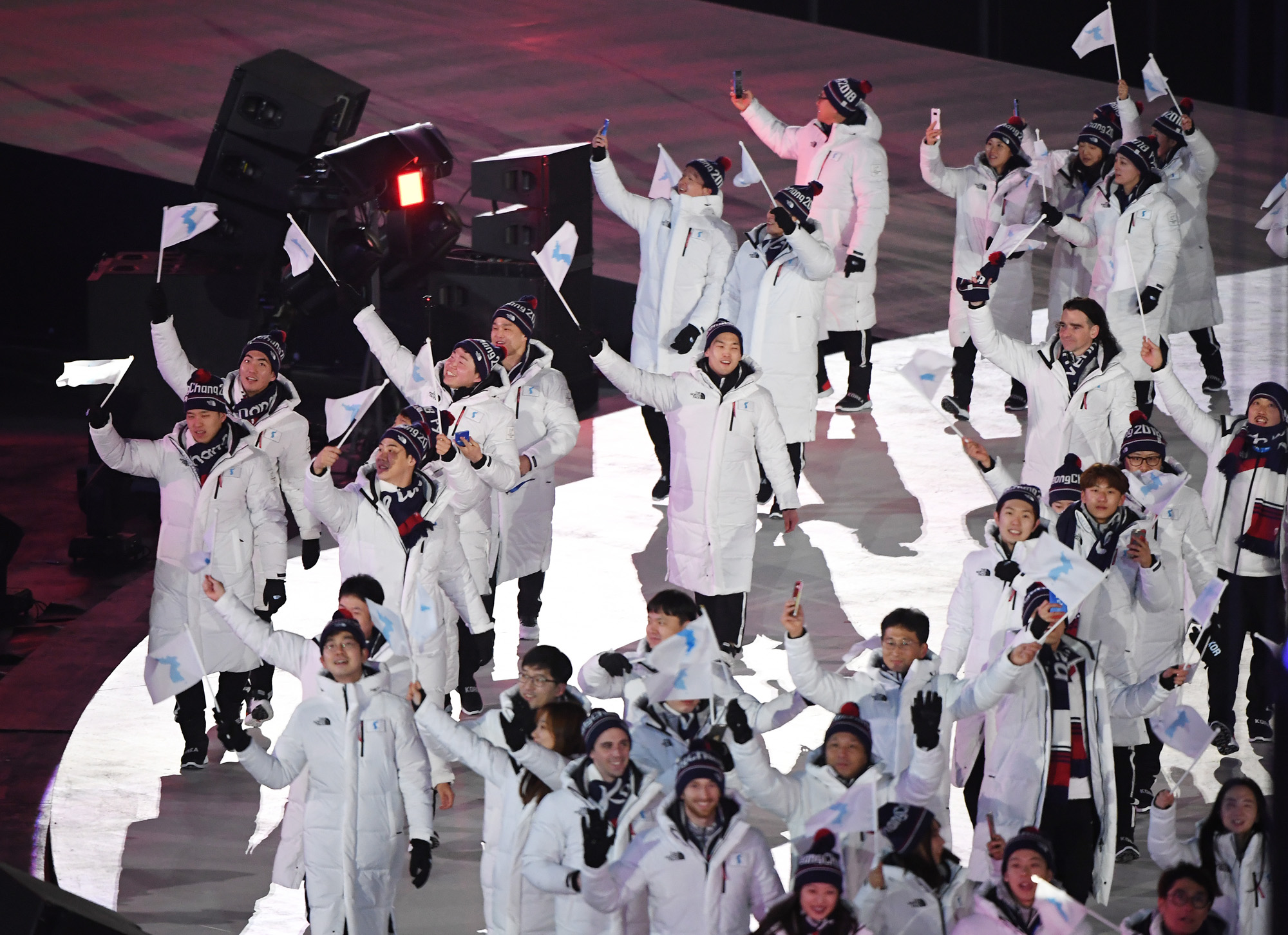 9일 오후 강원도 평창 올림픽 스타디움에서 열린 2018 평창동계올림픽 개회식에 남북 단일 입장을 하고 있다.
