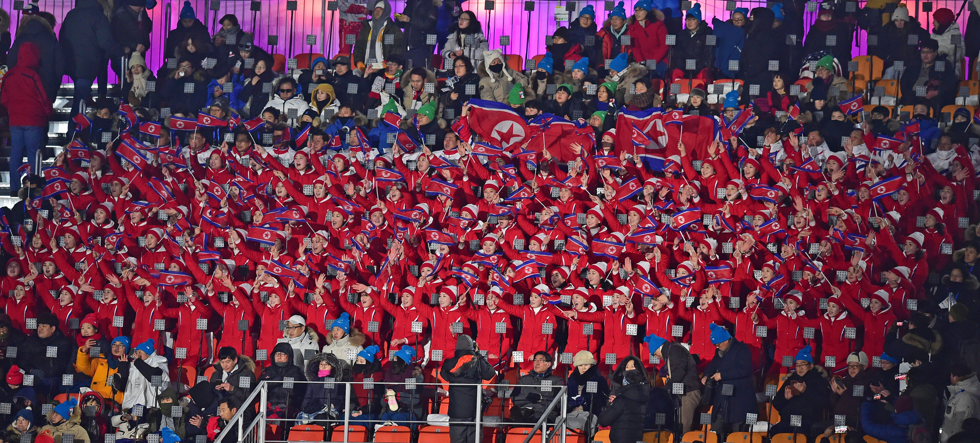 9일 오후 강원도 평창 올림픽 스타디움에서 열린 2018 평창동계올림픽 개회식에 참석한 북한 응원단이 인공기를 흔들며 응원을 하고 있다. /송의주 기자songuijoo@
