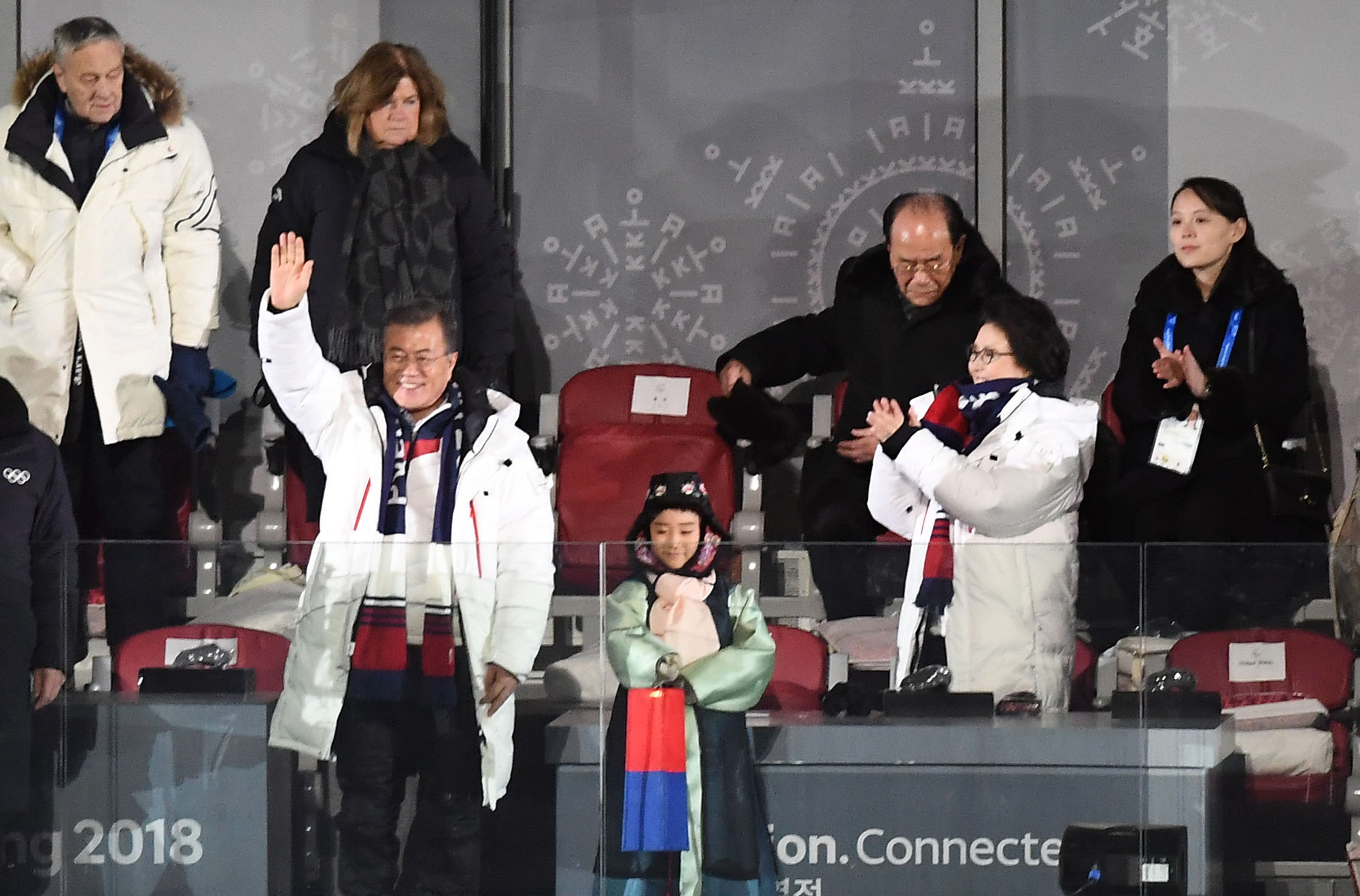 9일 오후 강원도 평창 올림픽 스타디움에서 열린 2018 평창동계올림픽 개회식에서 북한 태권도 시범단과 대한민국 문재인 대통령이 인사를 하자 북한 김정은의 동생 김여정이 박수를 치고 있다.