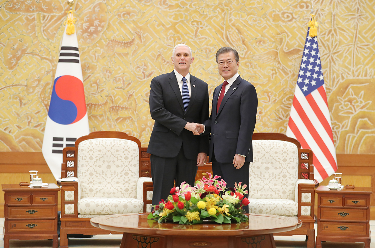 문재인 대통령이 8일 오후 청와대에서 마이크 펜스 미국 부통령을 만나 악수하고 있다. 2018.2.8