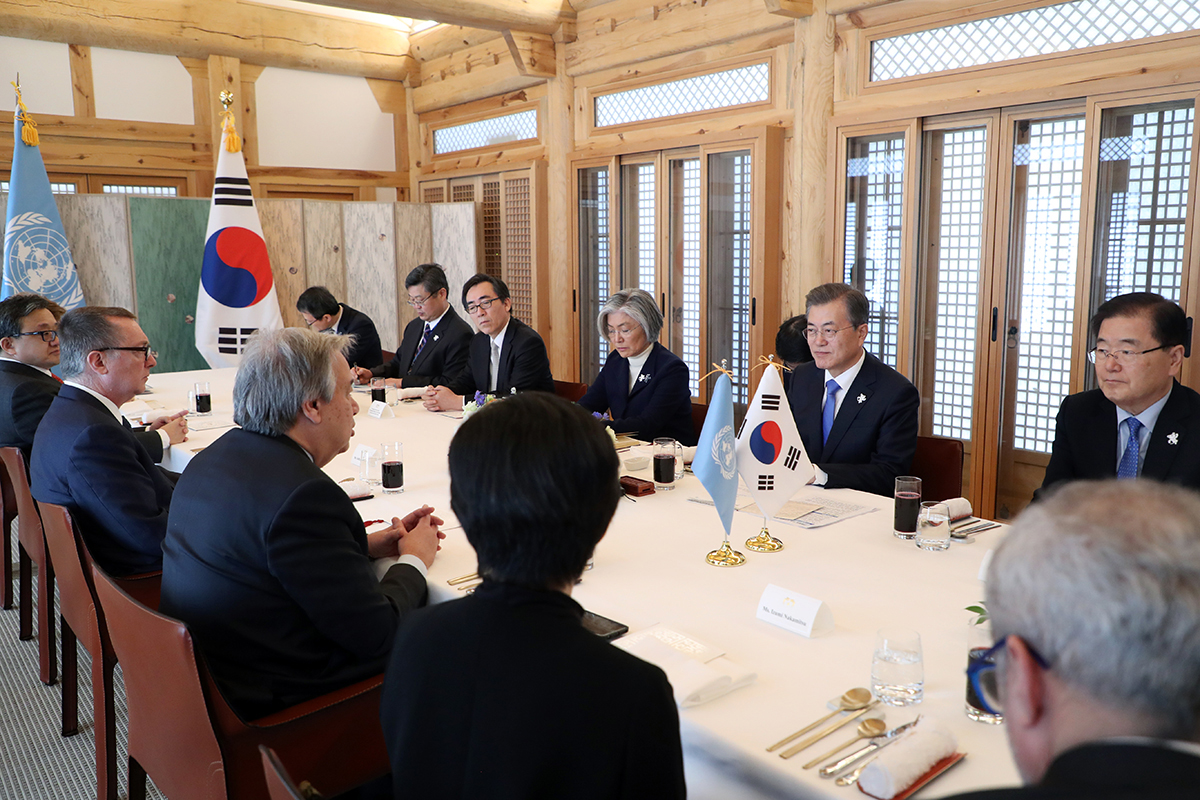 문재인 대통령이 9일 오전 강원도 강릉 호아재에서 안토니우 구테흐스 유엔 사무총장과 회담을 하고 있다. 2018.2.9