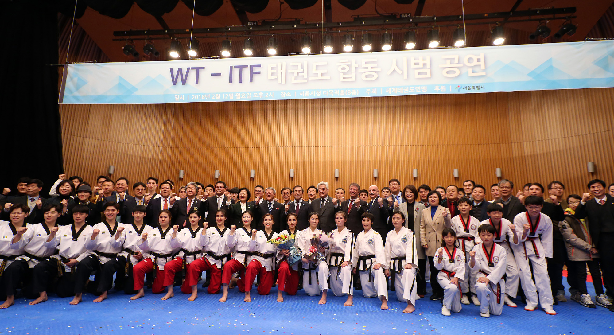 12일 오후 서울 중구 서울특별시청 다목적홀에서 열린 세계태권도연맹(WT)과 국제태권도연맹(ITF) 태권도 합동 시범공연(남·북태권도 합동 시범공연)을 마치고 남측과 북측 선수들과 관계자들이 기념촬영을 하고 있다. 2018.02.12 사진공동취재단