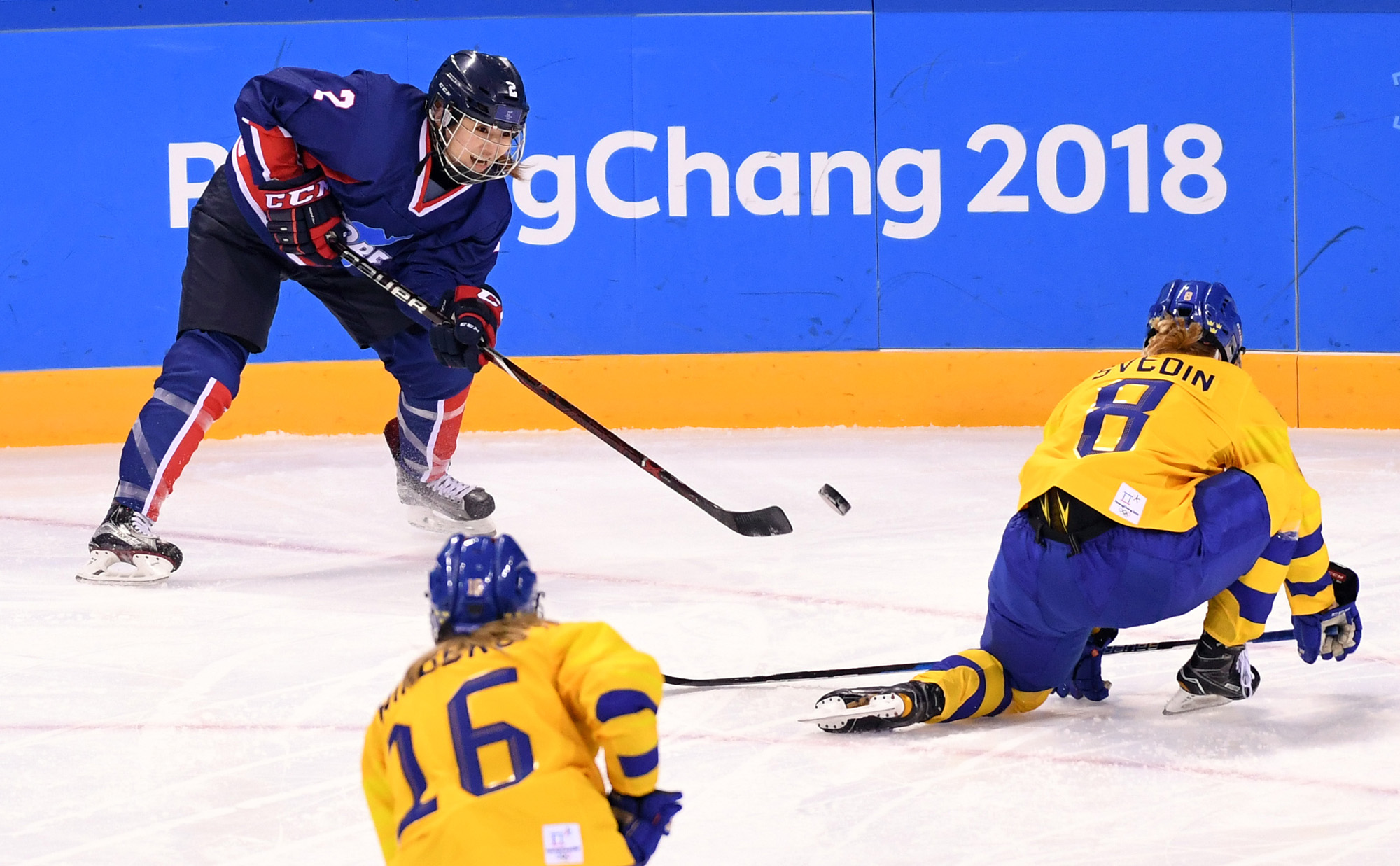 12일 저녁 강원도 강릉시 관동하키센터에서 열린 2018평창동계올림픽 여자 아이스하키 조별예선 2차전 남북단일팀과 스웨덴의 경기에서 한국의 고혜인이 공격을 시도하고 있다. / 2018. 02. 12 2018평창사진공동취재단