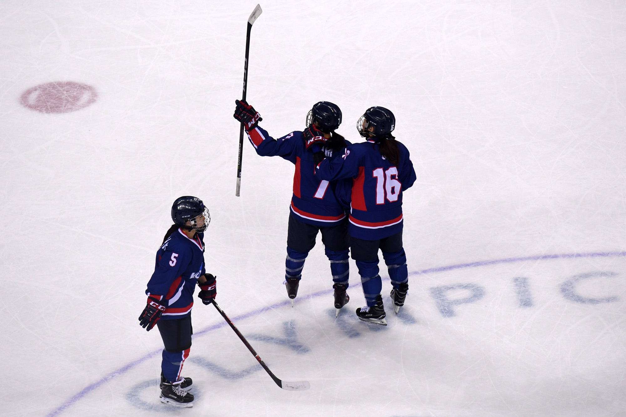 남북 여자하키 단일팀이 12일 오후 강원도 강릉시 관동하키센터에서 열린 조별예선 2차전에 스웨덴에게 0-8로 패배한 뒤 임진경과 조수지 선수가 관람석을 향해 인사하고 있다. . 2018. 02. 12 2018평창사진공동취재단