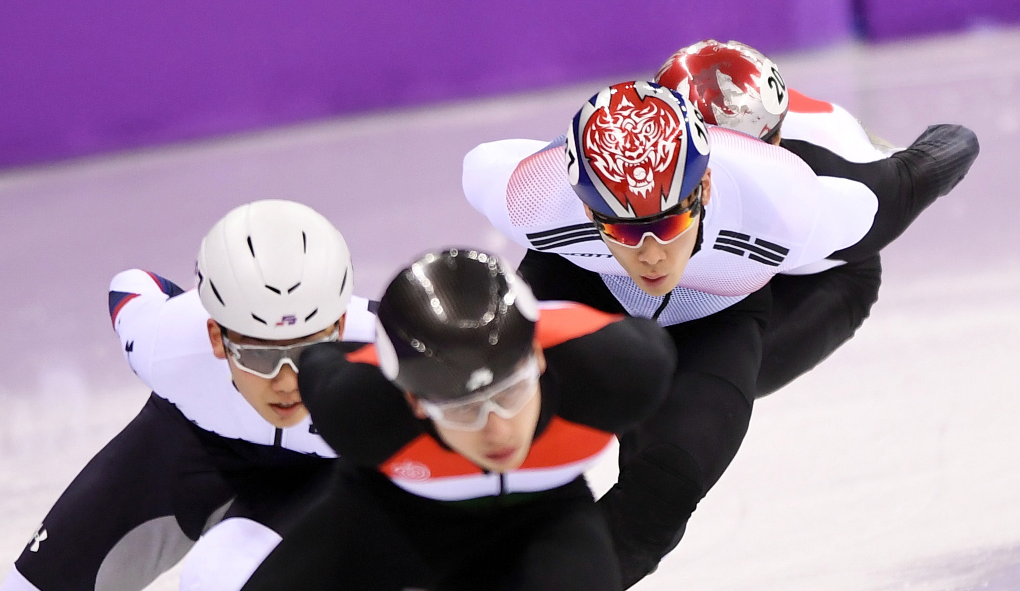 한국의 김도겸이 13일 오후 강원도 강릉아이스아레나에서 열린 2018평창동계올림픽 쇼트트랙 남자 5000m 계주 준결선 경기에서 질주하고 있다. 2018 02. 13 2018평창사진공동취재단