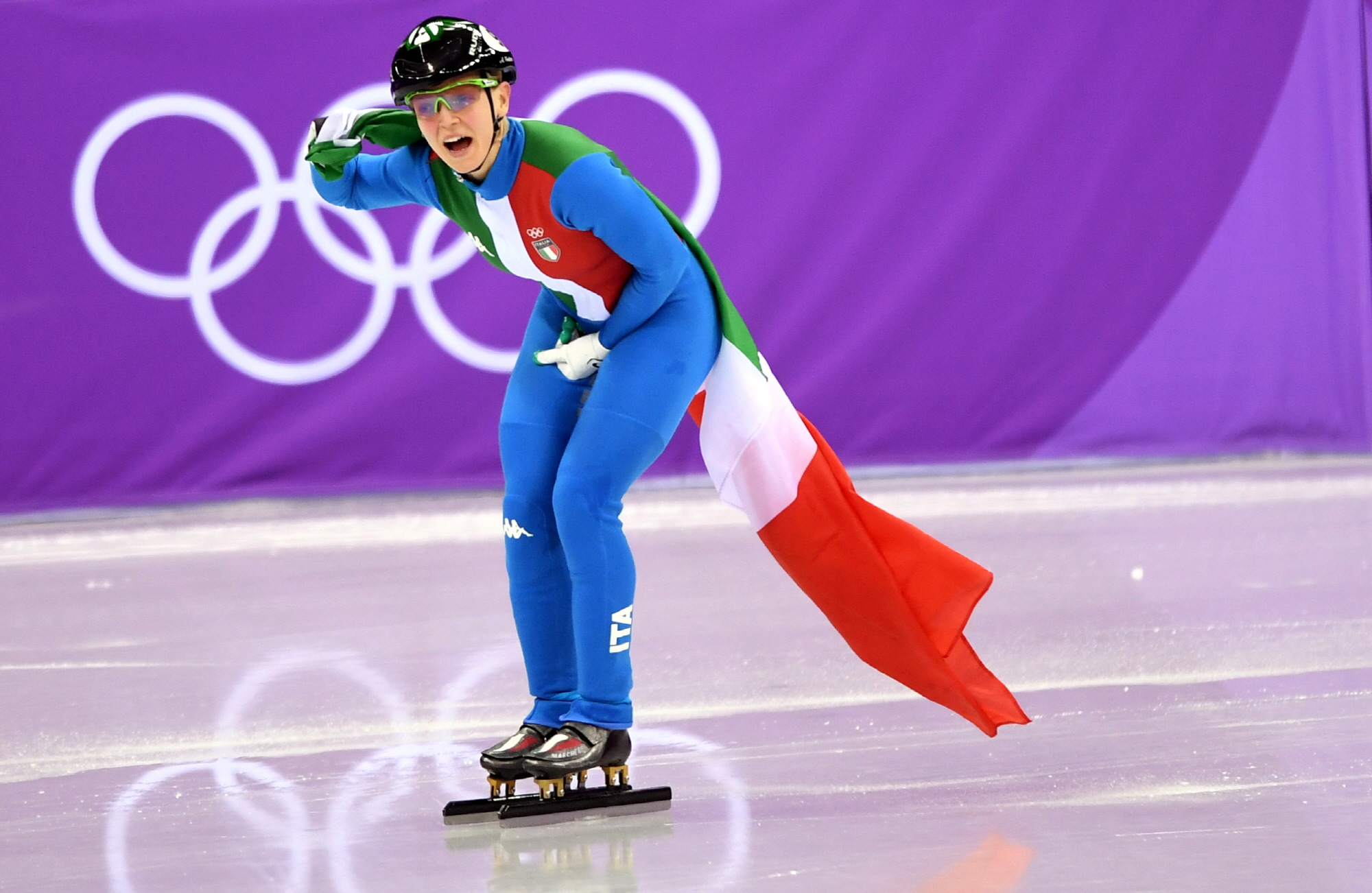 13일 오후 강원도 강릉아이스아레나에서 열린 2018평창동계올림픽 쇼트트랙 여자 500m 결선 경기에서 이탈리아 아리아나 폰타나가 1위를 한 후 기뻐하고 있다. 이날 한국의 최민정은 2위로 골인 했으나 페널티를 받고 실격 처리됐다. 2018.2.13 2018평창사진공동취재단