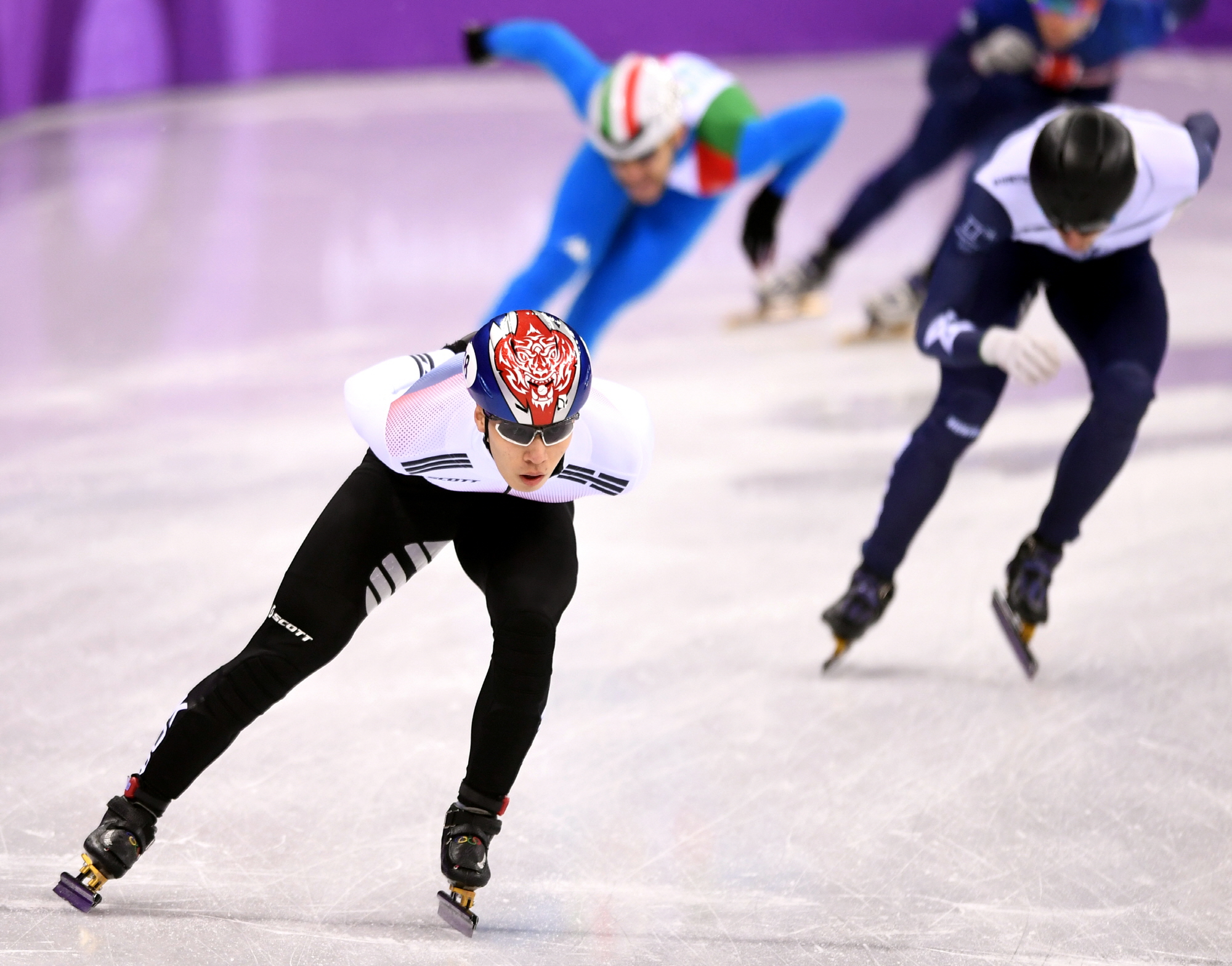 한국의 황대헌이 13일 오후 강원도 강릉아이스아레나에서 열린 2018평창동계올림픽 쇼트트랙 남자 1000m 예선 경기에서 역주하고 있다. 2018.2.13 2018평창사진공동취재단