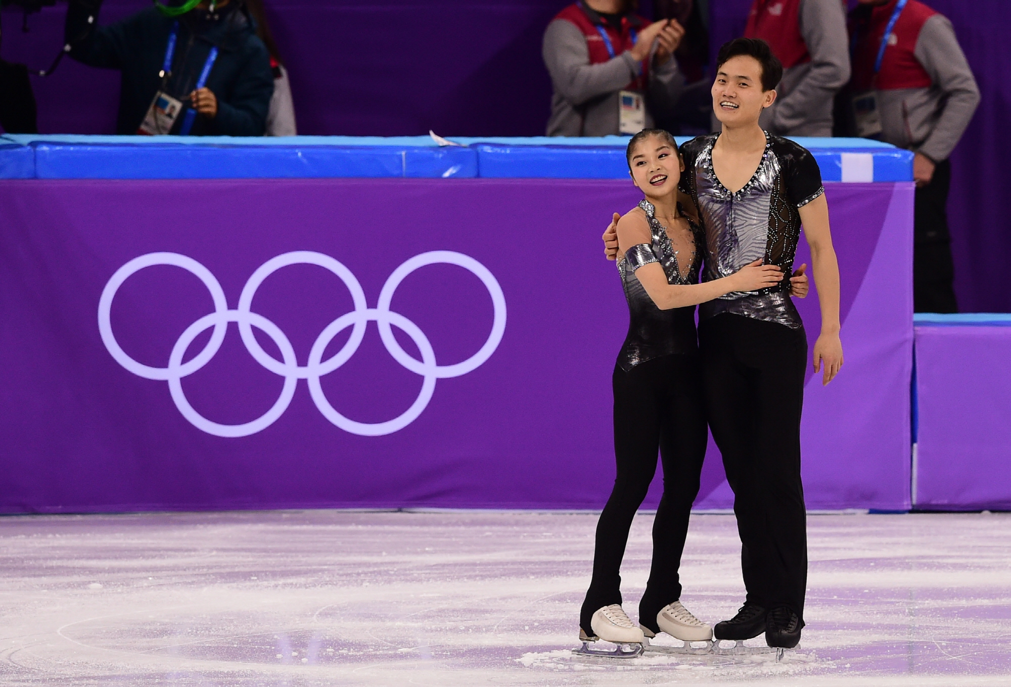 북한 렴대옥-김주식이 14일 강원도 강릉 아이스아레나에서 열린 2018 평창동계올림픽 피겨스케이팅 페어 쇼트프로그램에 출전해 연기를 마친 뒤 미소 짓고 있다.2018.2.14 2018평창사진공동취재단
