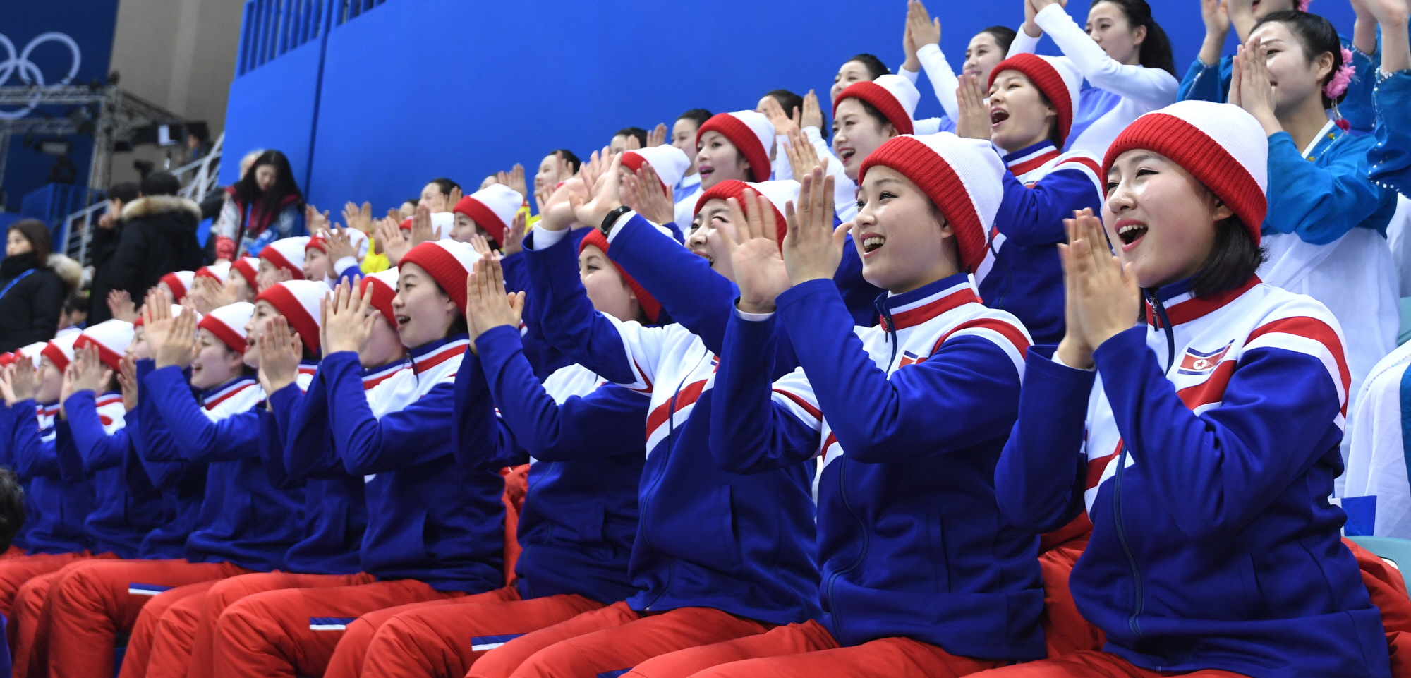 14일 오후 강원도 강릉 관동하키센터에서 여자아이스하키 남북 단일팀과 일본의 경기를 앞두고 북한 응원단이 입장해 응원전을 펼치고 있다. 2018. 02. 14 2018평창사진공동취재단