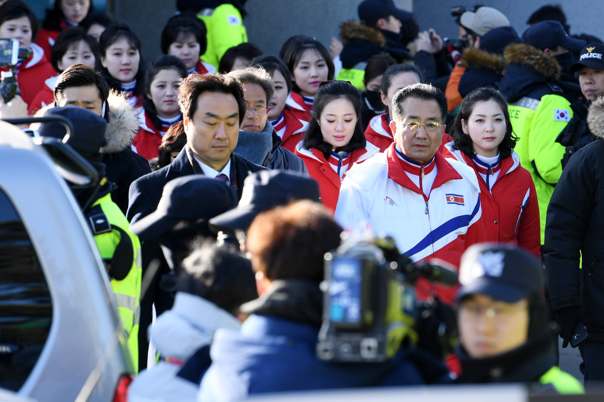북한 응원단이 17일 오후 강원도 평창군 상지대관령고등학교 내 마련된 '고려황궁 개성 만월대 남북 공동발굴 평창 특별전' 관람을 위해 입장하고 있다. 2018. 02. 17 2018평창사진공동취재단