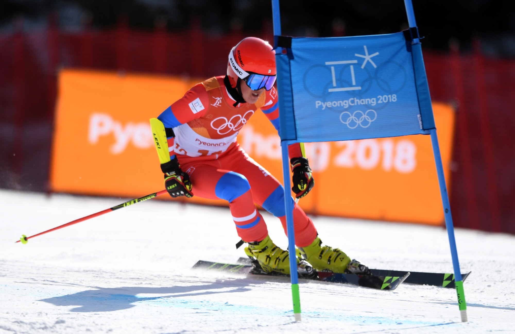 18일 강원도 평창 용평 알파인 경기장에서 2018평창동계올림픽 알파인스키 남자 대회전 경기가 열린 가운데 북한의 강성일이 기문을 통과하고 있다./2018.2.18 2018평창사진공동취재단