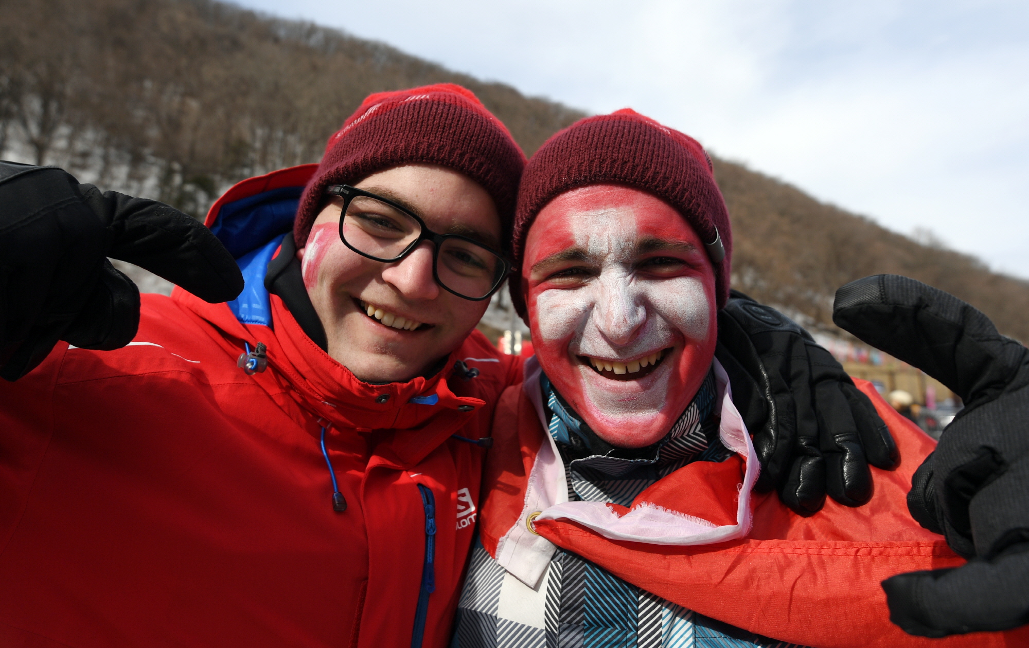 18일 강원도 평창 용평 알파인 경기장에서 2018평창동계올림픽 알파인스키 남자 대회전 경기가 열린 가운데 스위스 응원단이 페이스페인팅을 하고 미소 짓고 있다./2018.2.18 2018평창사진공동취재단