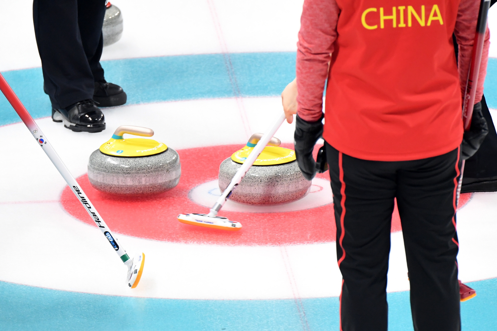18일 오후 강원도 강릉 컬링센터에서 열린 2018 평창동계올림픽 여자 컬링 예선 한국과 중국의 경기에 한국 김경애와 김초희가 스위핑으로 스톤을 정가운데 넣고 있다. 2018. 02. 18 2018평창사진공동취재단
