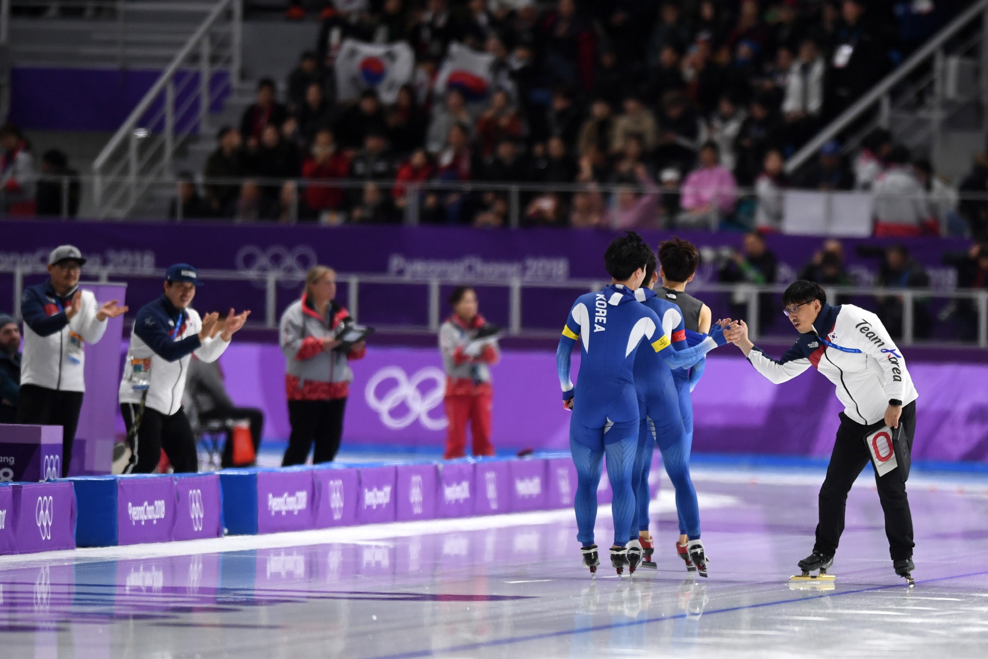 18일 오후 강원도 강릉 스피드 스케이팅장에서 열린 2018 평창동계올림픽 남자 스피드 스케이팅 팀추월 준준결선에 출전한 정재원, 이승훈, 김민석이 레이스를 마치고 박수받고 있다. 2018. 02. 18 2018평창사진공동취재단