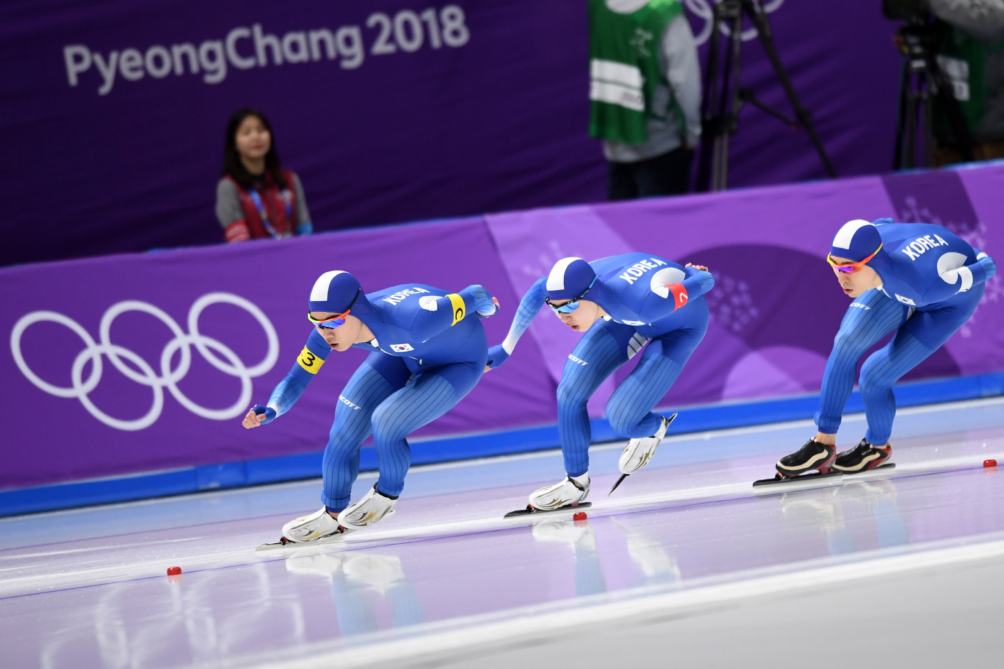 18일 오후 강원도 강릉 스피드 스케이팅장에서 열린 2018 평창동계올림픽 남자 스피드 스케이팅 팀추월 준준결선에 출전한 김민석, 정재원, 이승훈이 질주하고 있다. 2018. 02. 18 2018평창사진공동취재단