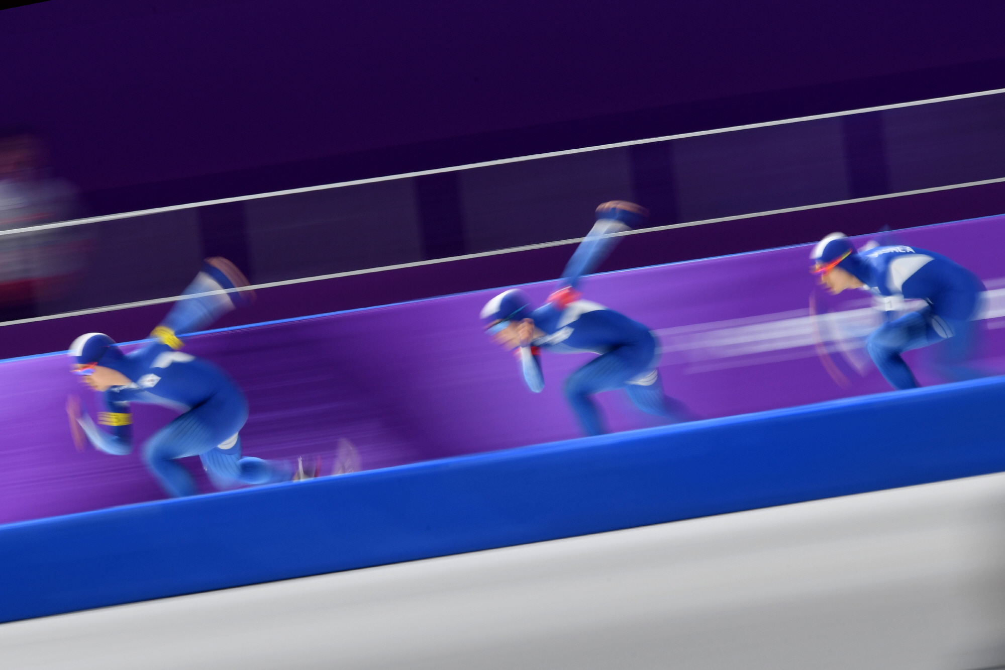 18일 오후 강원도 강릉 스피드 스케이팅장에서 열린 2018 평창동계올림픽 남자 스피드 스케이팅 팀추월 준준결선에 출전한 김민석, 정재원, 이승훈이 질주하고 있다. 2018. 02. 18 2018평창사진공동취재단