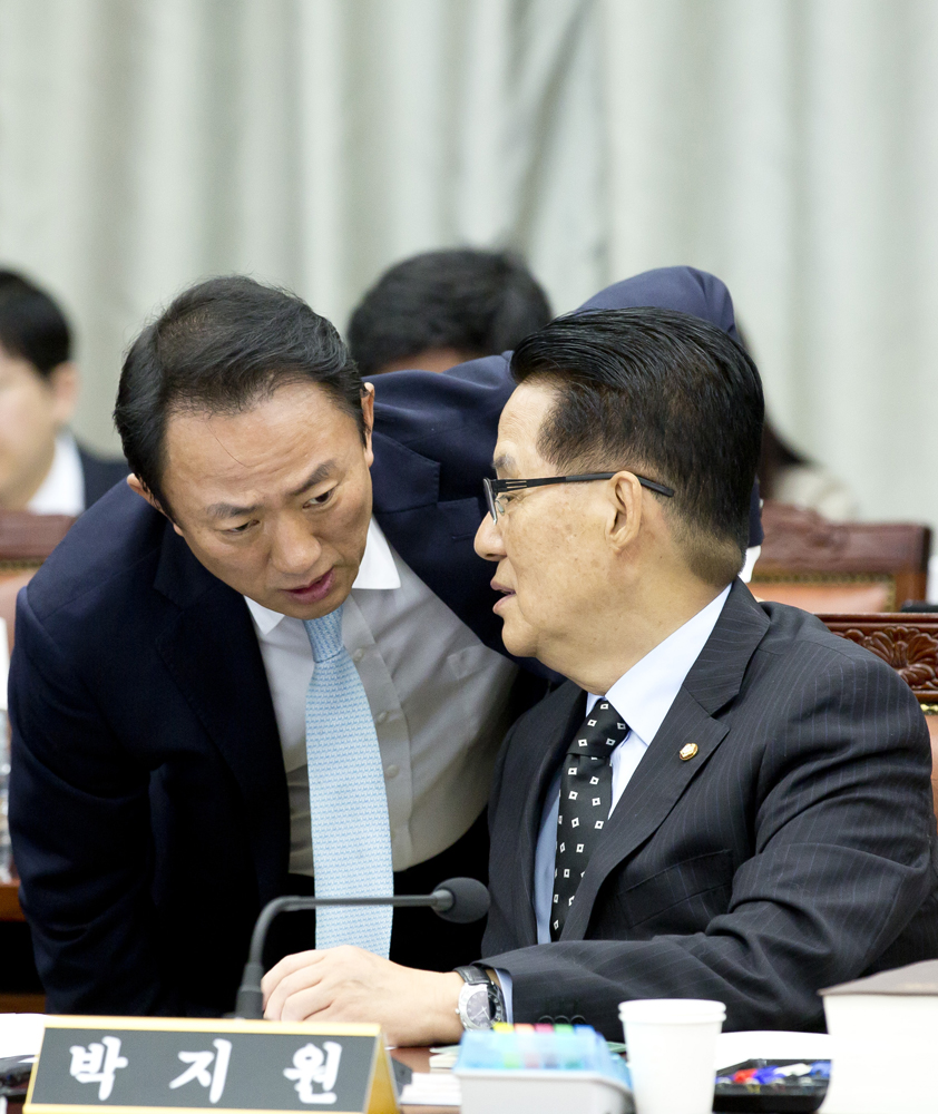 Eoimage=서울] 임준선 기자 = 4일 오전 서울 서초동 서울고등검찰청에서 열린 국회 법제사법위원회의 서울고등검찰청에 대한 국정감사에서 박지원의원이 이야기를 나누고 있다. . 2016.10.04 eomaster@eoimage.com