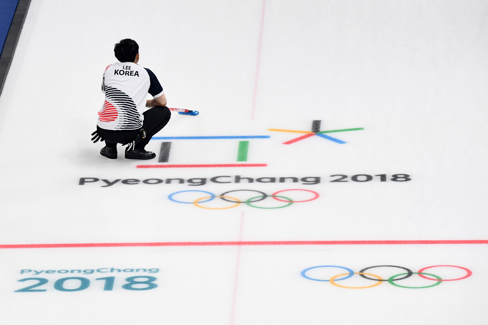 19일 오후 강원도 강릉 컬링센터에서 열린 2018 평창동계올림픽 남자 컬링 예선 7차전 한국과 이탈리아의 경기에 출전한 한국 이기복이 투구를 마친 뒤 방향을 보고 있다. 2018. 02. 19 사진/ 2018평창사진공동취재단