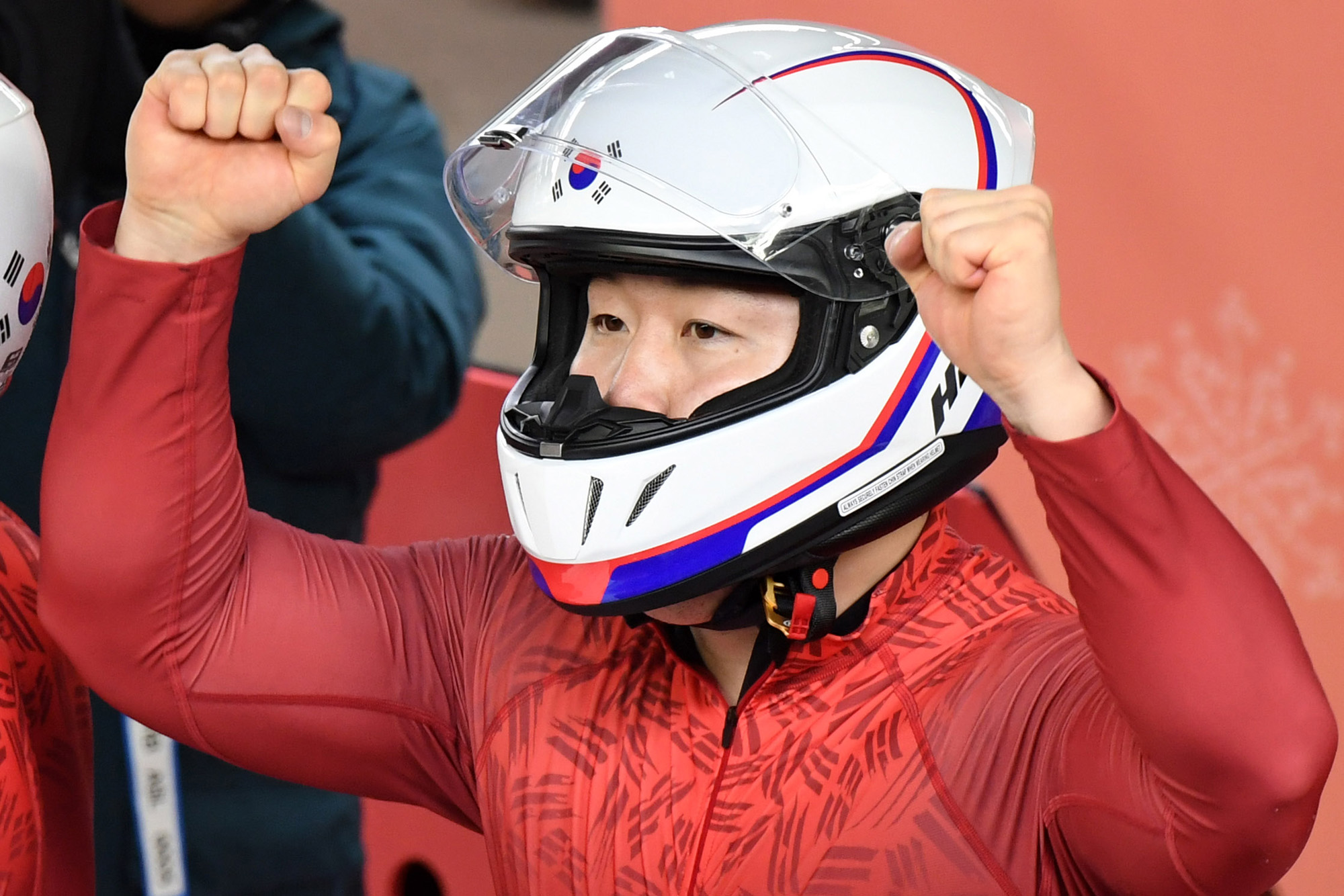 한국 대표팀 원윤종이 19일 오후 강원도 평창 올림픽 슬라이딩센터에서 열린 2018 평창동계올림픽 남자 봅슬레이 2인승 경기에서 4차 주행을 마치고 관중석을 향해 두 손을 불끈 쥐고 있다. 2018. 02. 19 사진/2018평창사진공동취재단